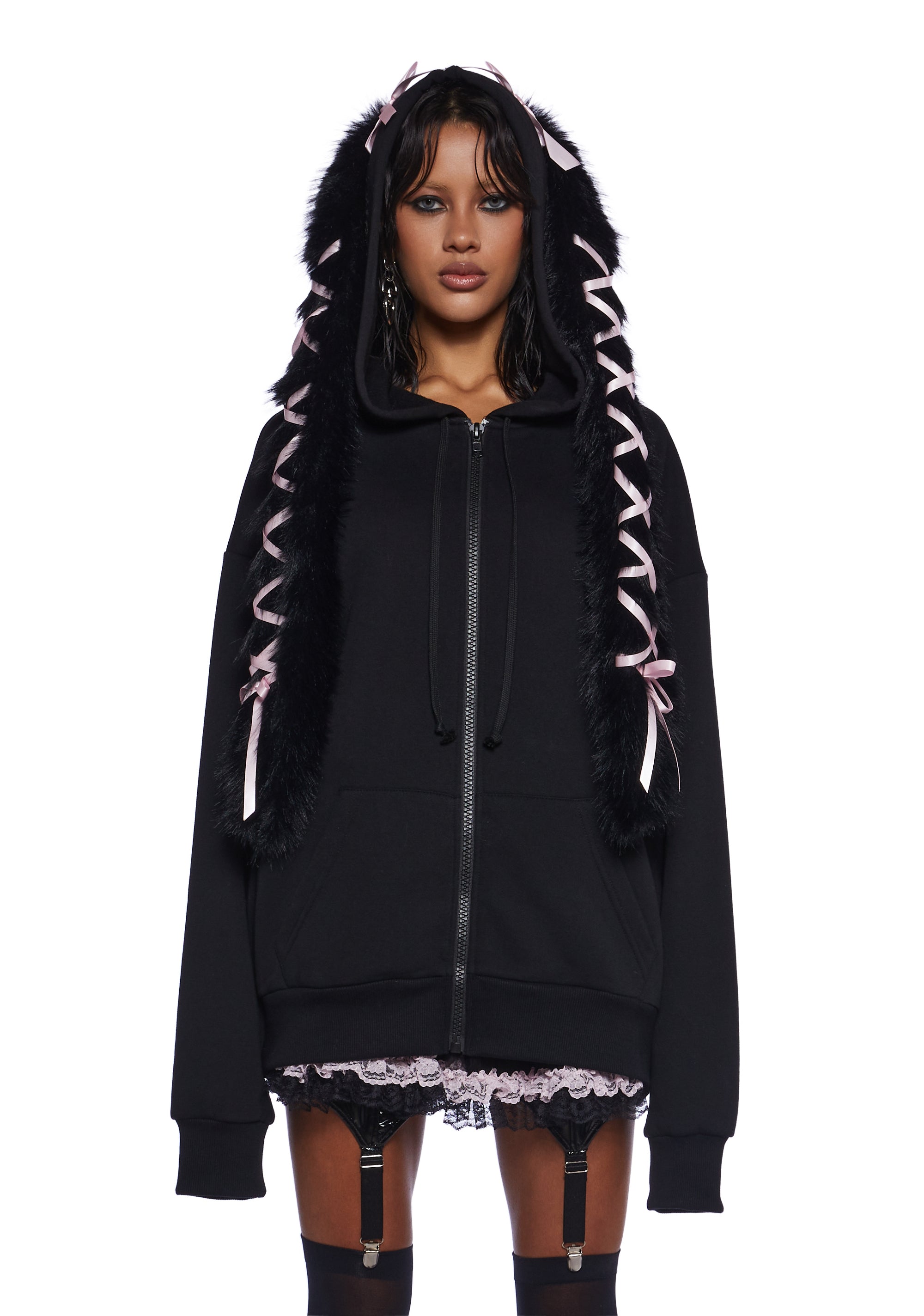 This zip-up hoodie has a soft knit construction, front kangaroo pockets, an attached hoodie with faux fur bunny ears adorned with bow appliques and a lace-up ribbon design, and a front zipper closure.