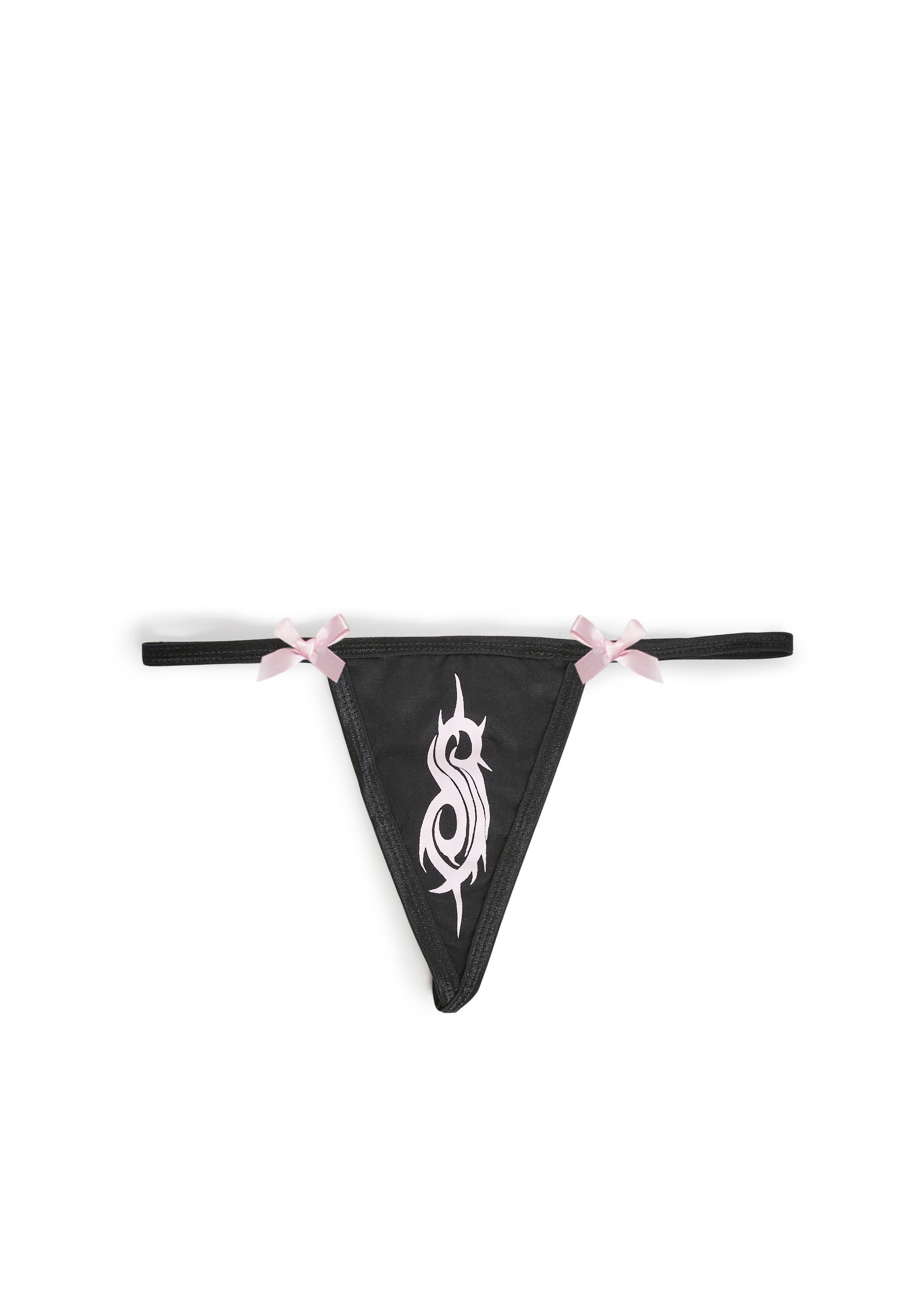 This thong panty has Slipknot band logo on the front and decorative pink bows.
