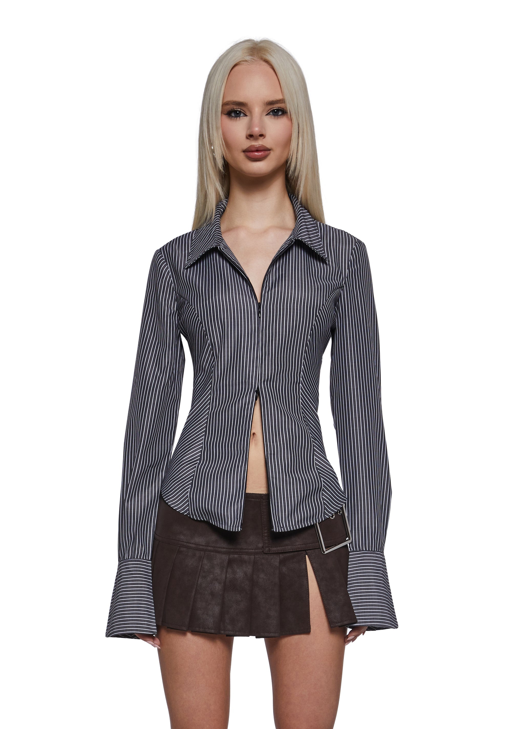 This blouse has a stretchy poplin construction, a collared neckline, long sleeves, and a double zippered closure.