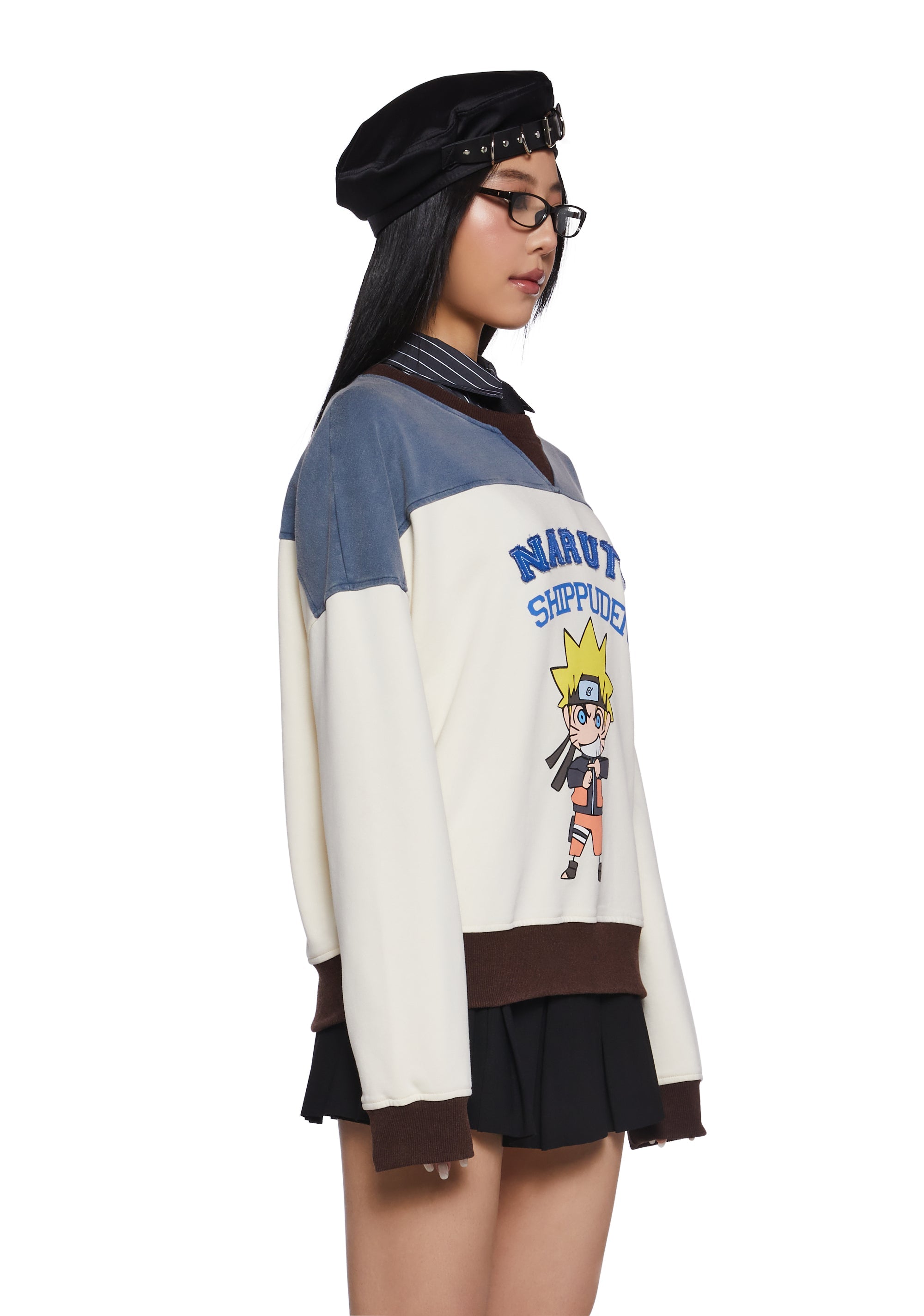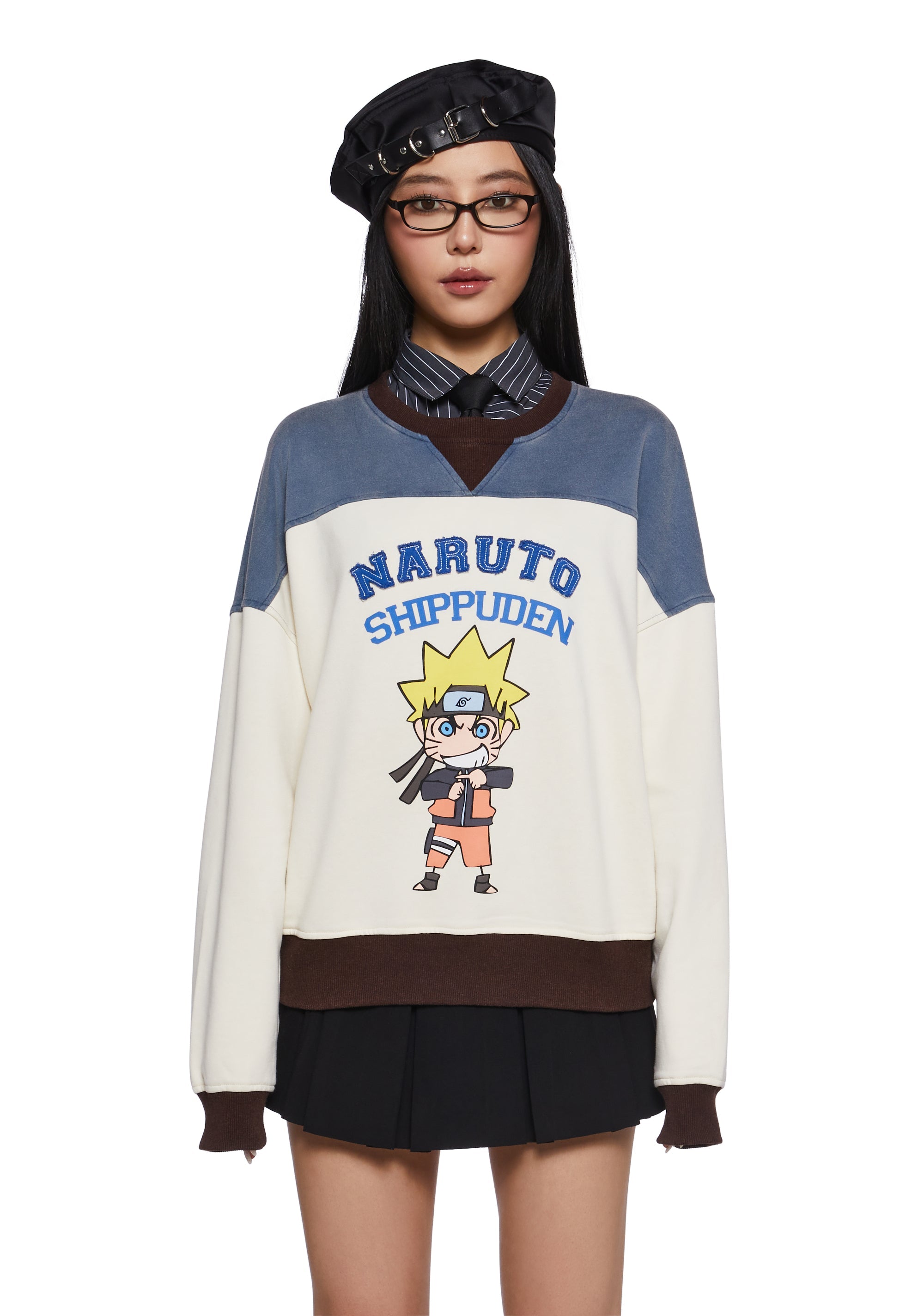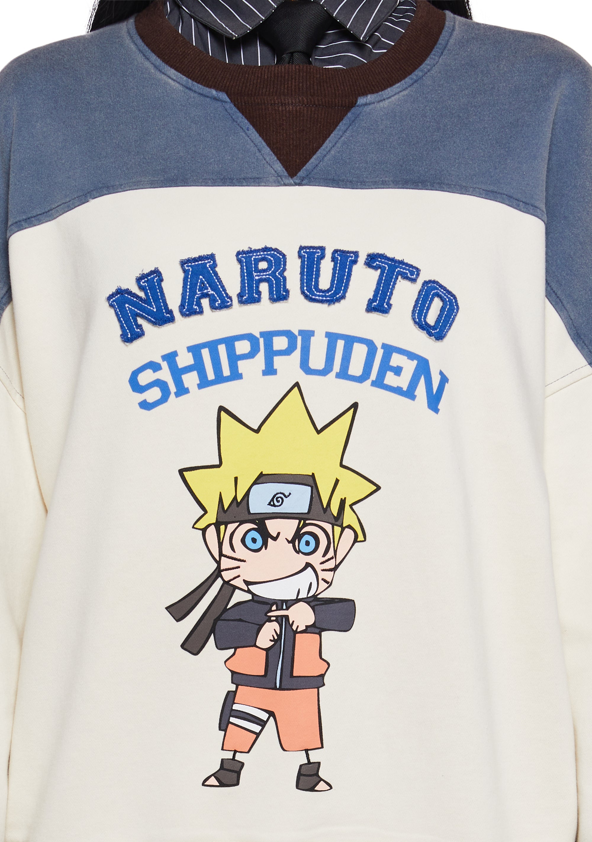 This crewneck sweatshirt has a washed stretchy knit construction with a vintage-inspired colorblock design, a contrast-colored ribbed knit collar, cuffs, and hem, front embroidery of Naruto over a graphic print of a chibi Naruto, and an oversized fit. Only Available In USA and Canada.