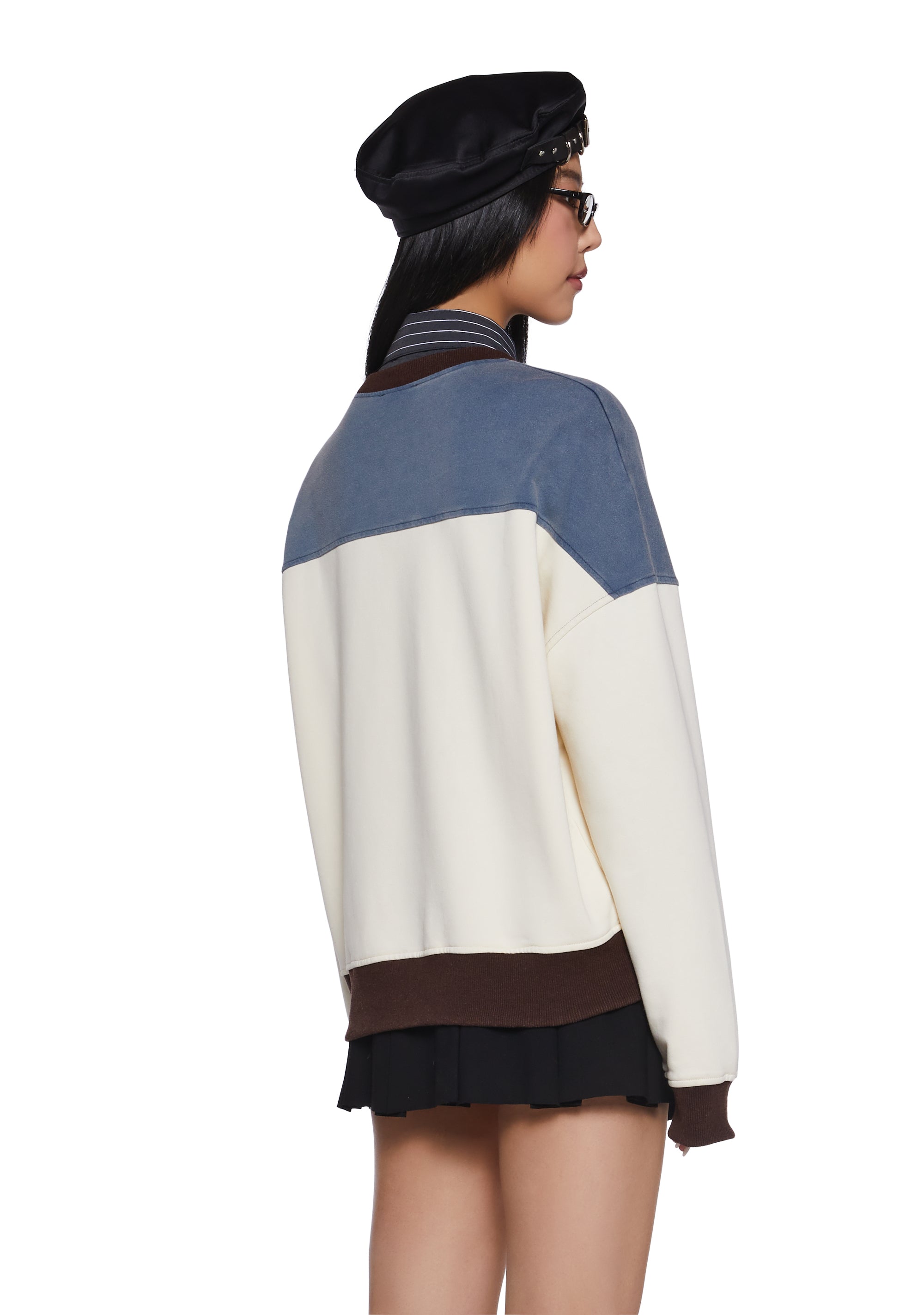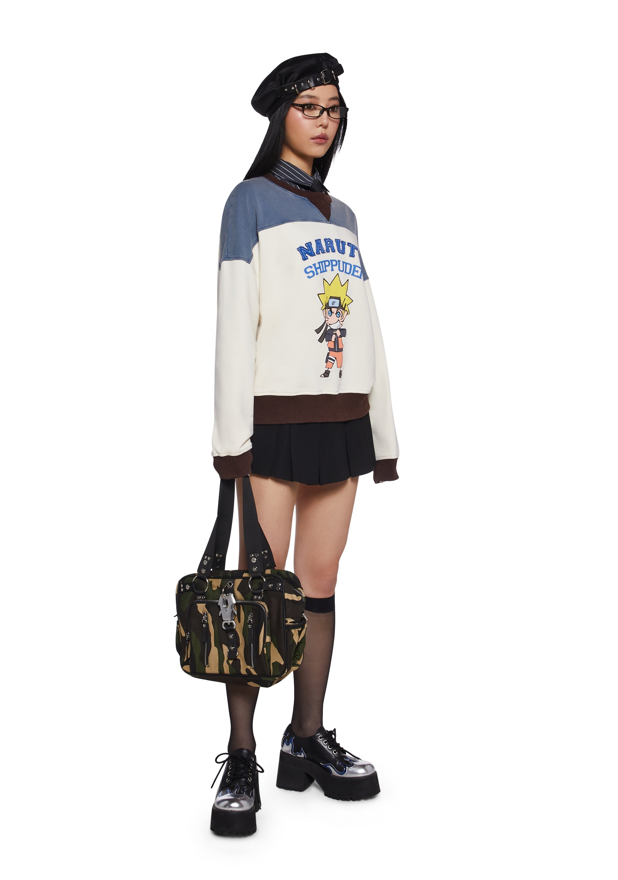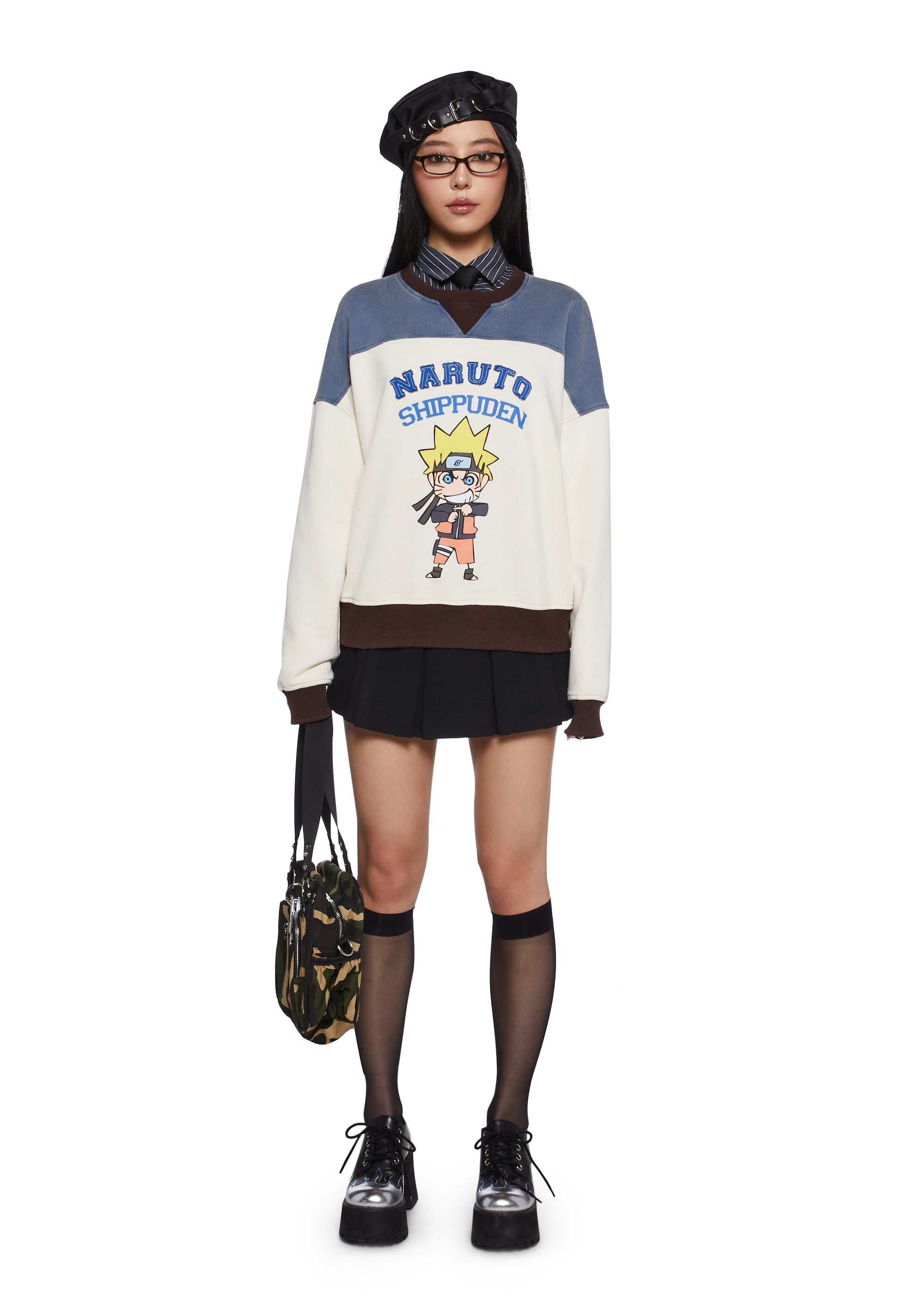 This crewneck sweatshirt has a washed stretchy knit construction with a vintage-inspired colorblock design, a contrast-colored ribbed knit collar, cuffs, and hem, front embroidery of Naruto over a graphic print of a chibi Naruto, and an oversized fit. Only Available In USA and Canada.