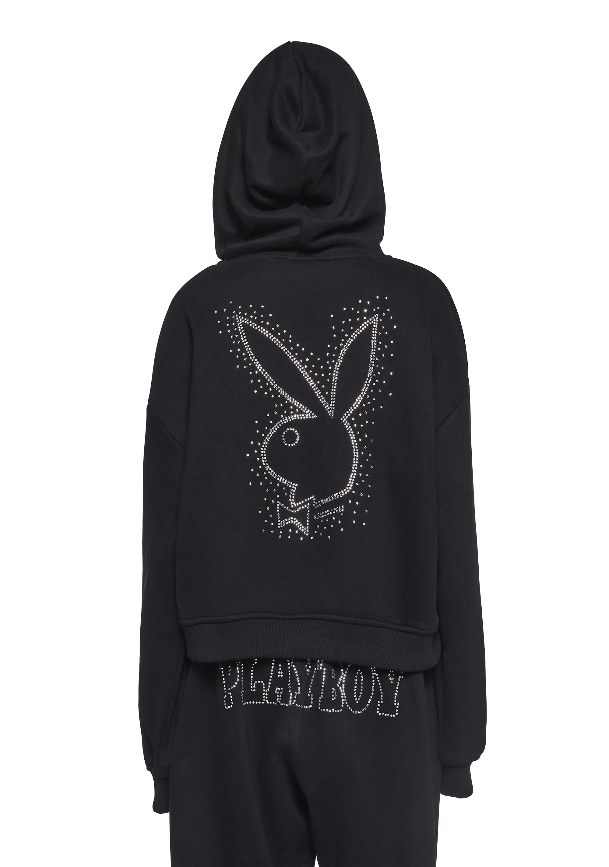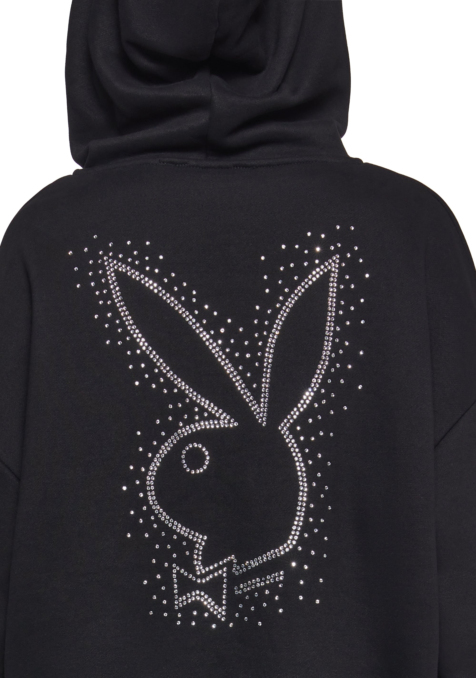 Stay cozy and iconic in this pullover hoodie featuring a relaxed fit, kangaroo pocket, drawstring hood, and sparkling rhinestone Playboy logo across the front and back.