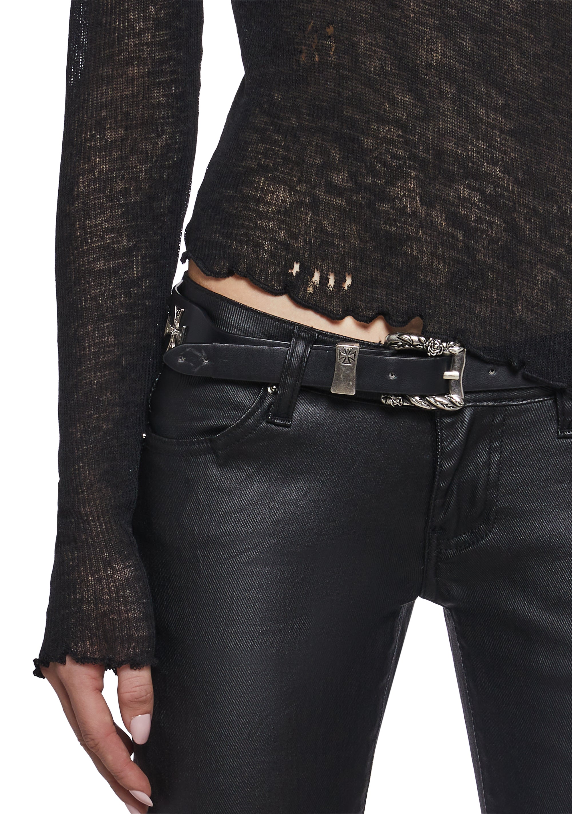Sleek and subtly edgy, this sheer knit long sleeve top features a lightweight, semi-transparent fabrication with a softly distressed finish. Designed to contour the body, it delivers an effortless layered look with a modern, minimalist vibe.