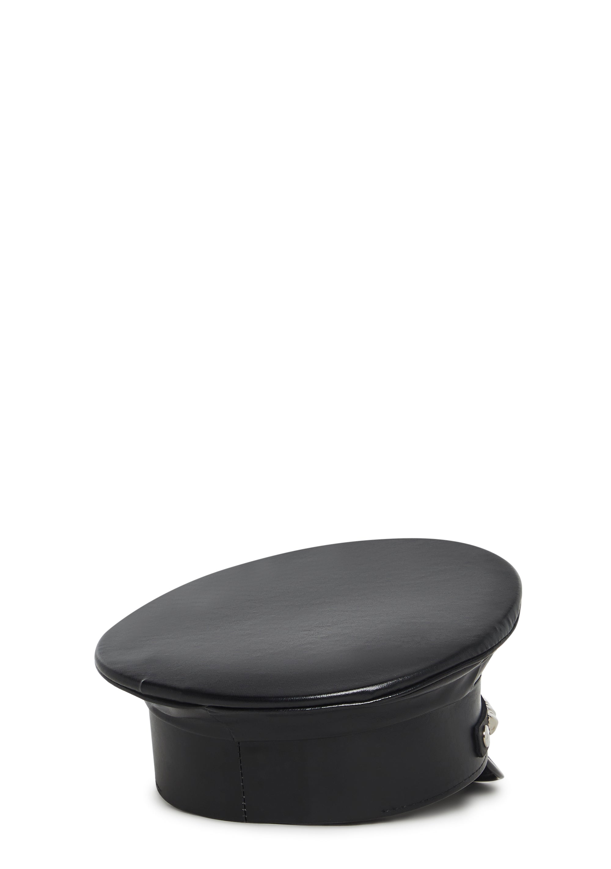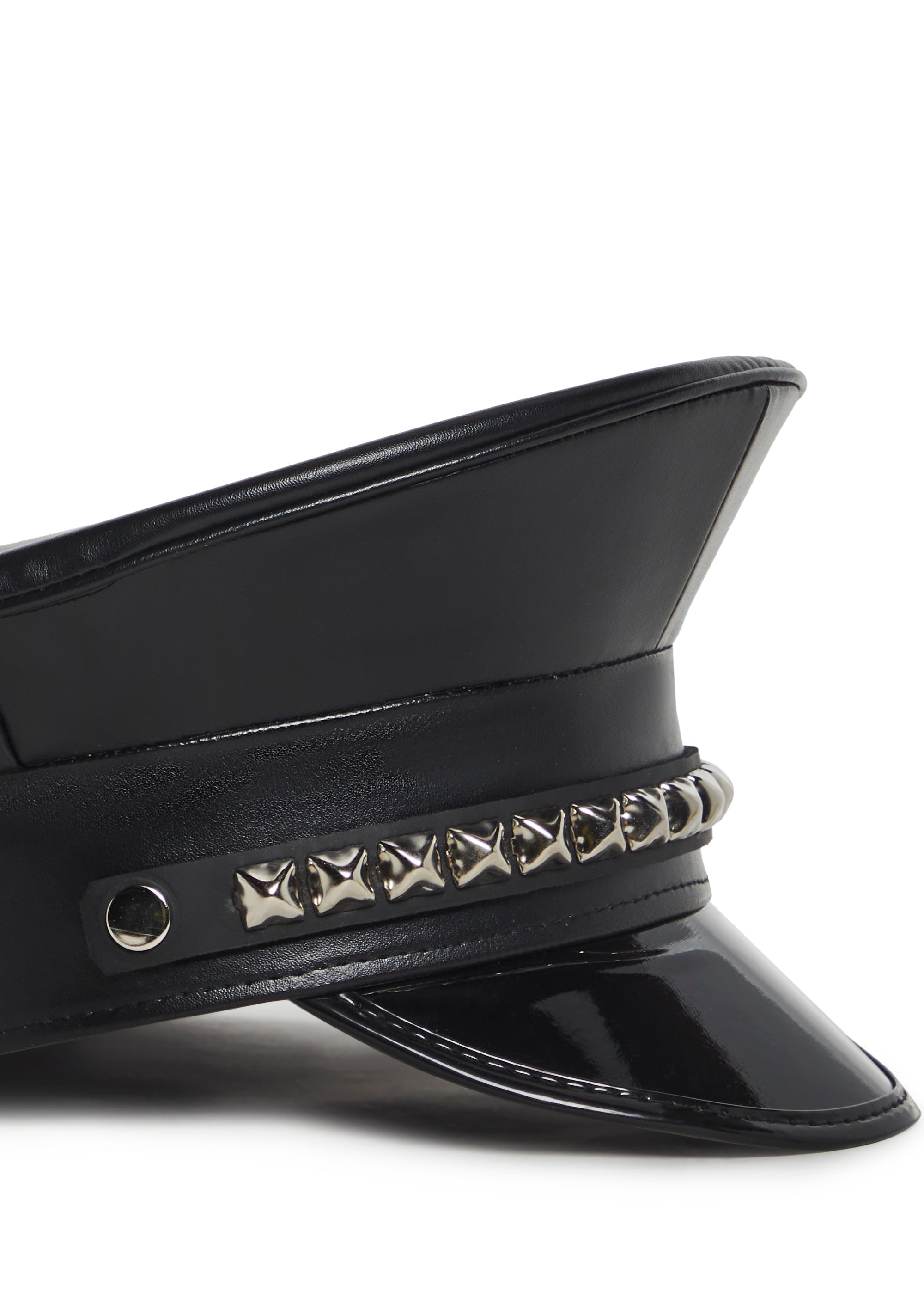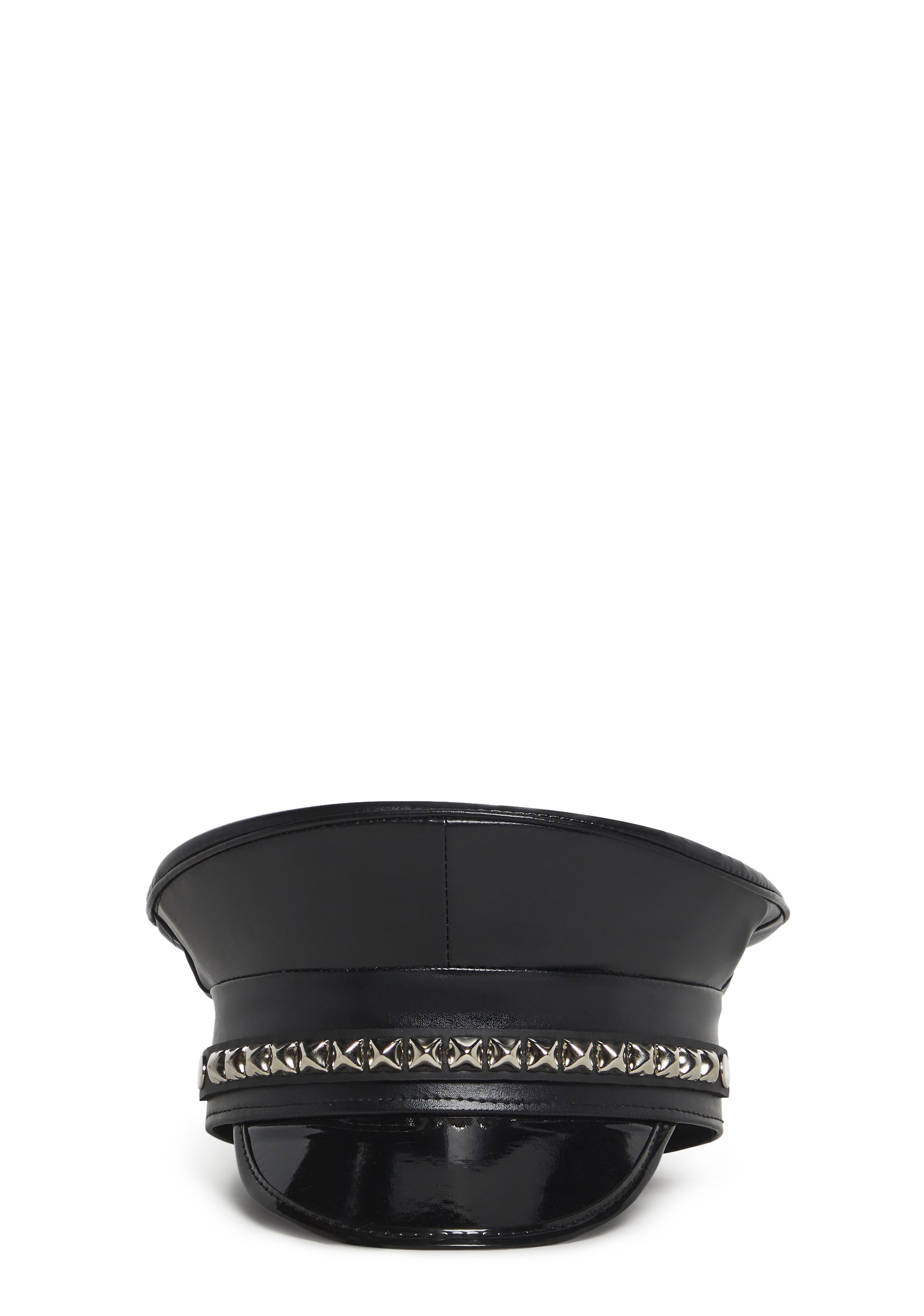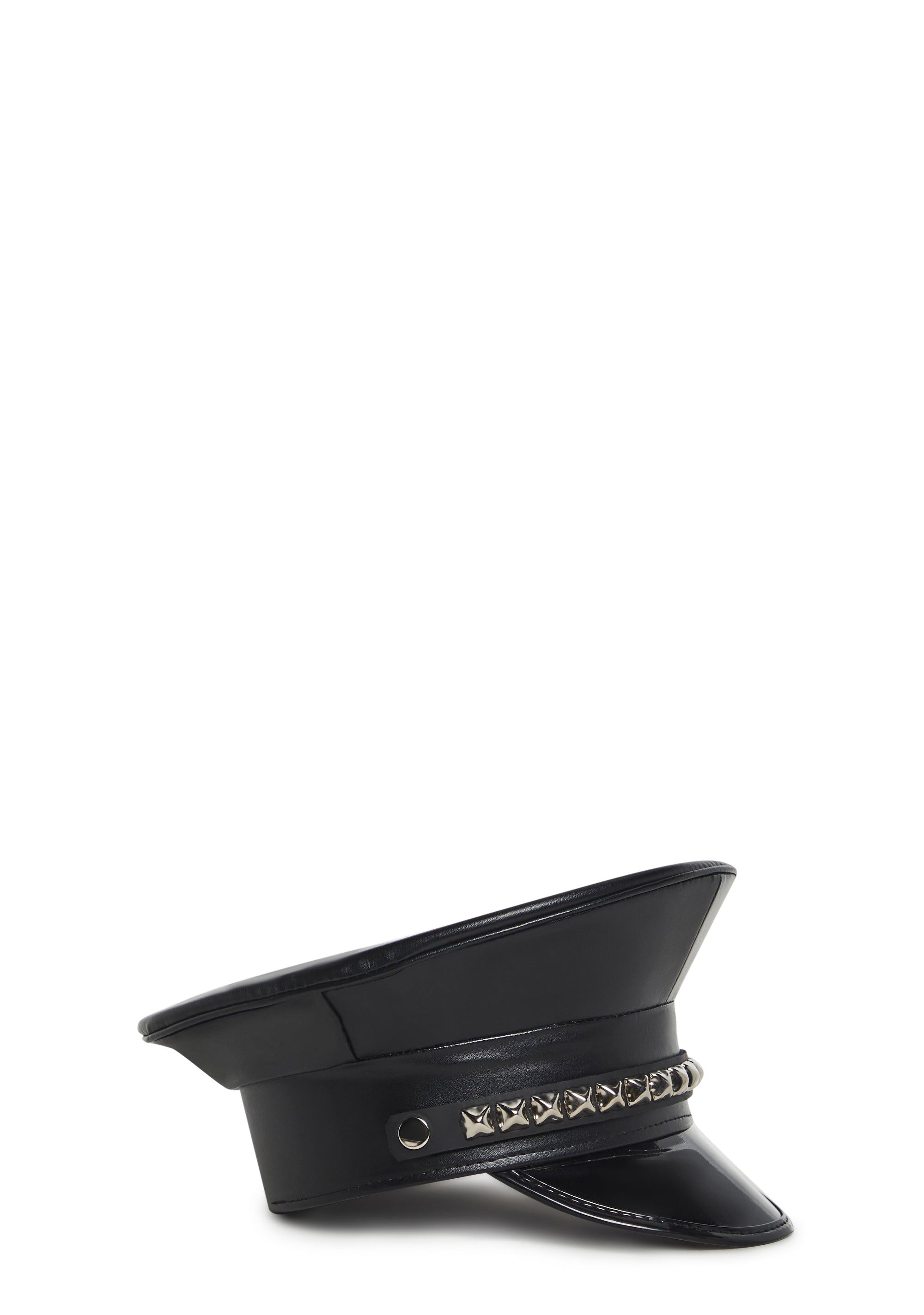 This captain hat has a vegan leather construction, a vinyl brim, and metal pyramid studs on the front.