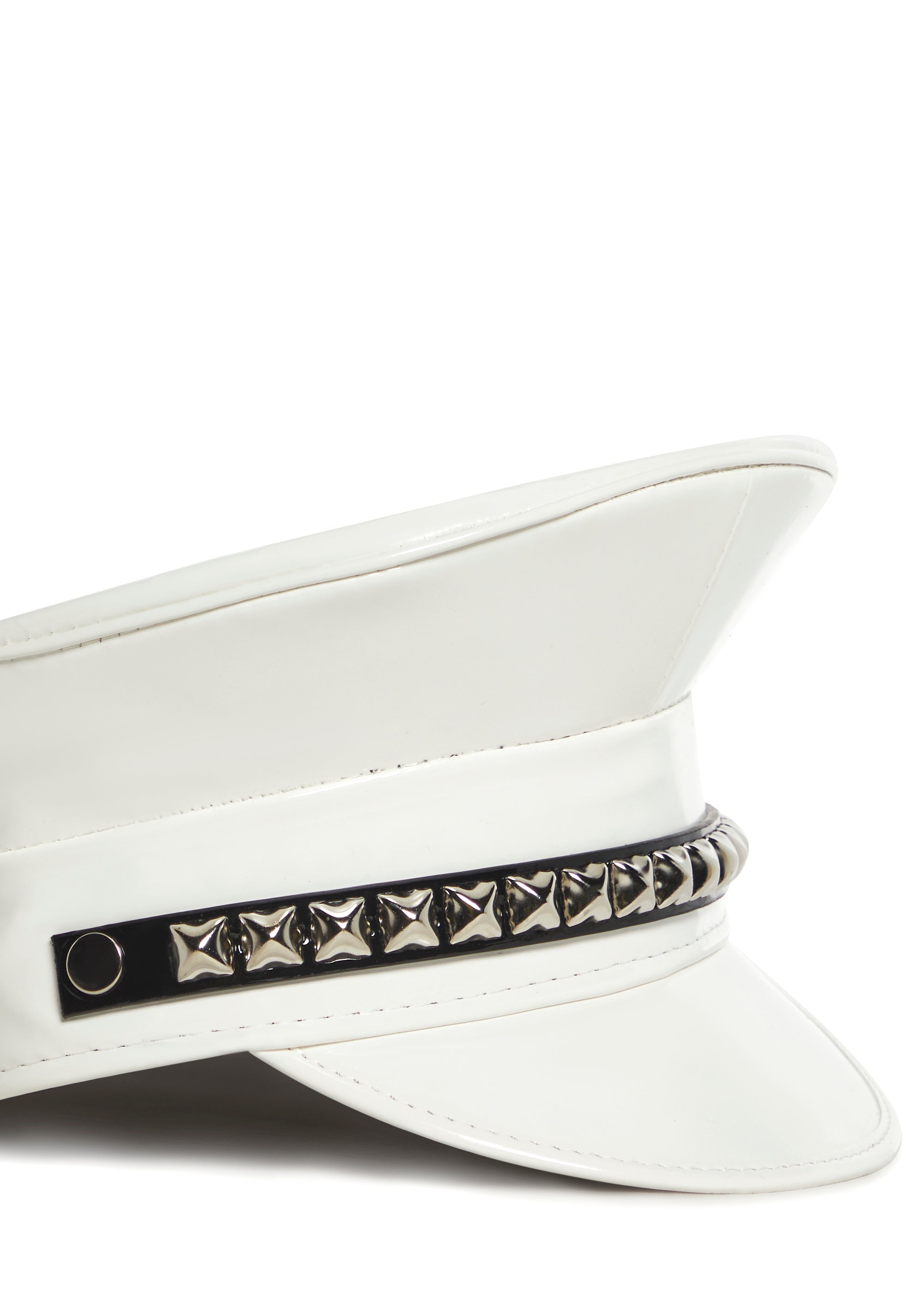 This captain hat has a vegan leather construction, a vinyl brim, and metal pyramid studs on the front.