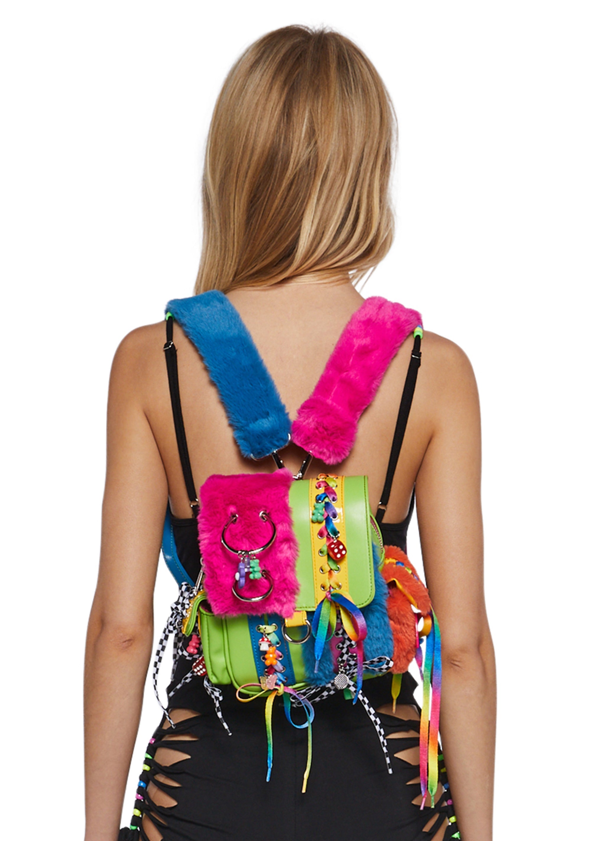 Go on a colossal ride with this mini backpack that has a vegan and faux fur construction, a multicolored pattern, side pockets with snap button closures, and lace up details with various charms like gummy bears, glitter butterflies, and hearts; a top zipper closure, a flap with rainbow ribbon lace-ups and charms, O-ring hardware with daisy and gummy bear charms, and adjustable removable faux fur shoulder straps.