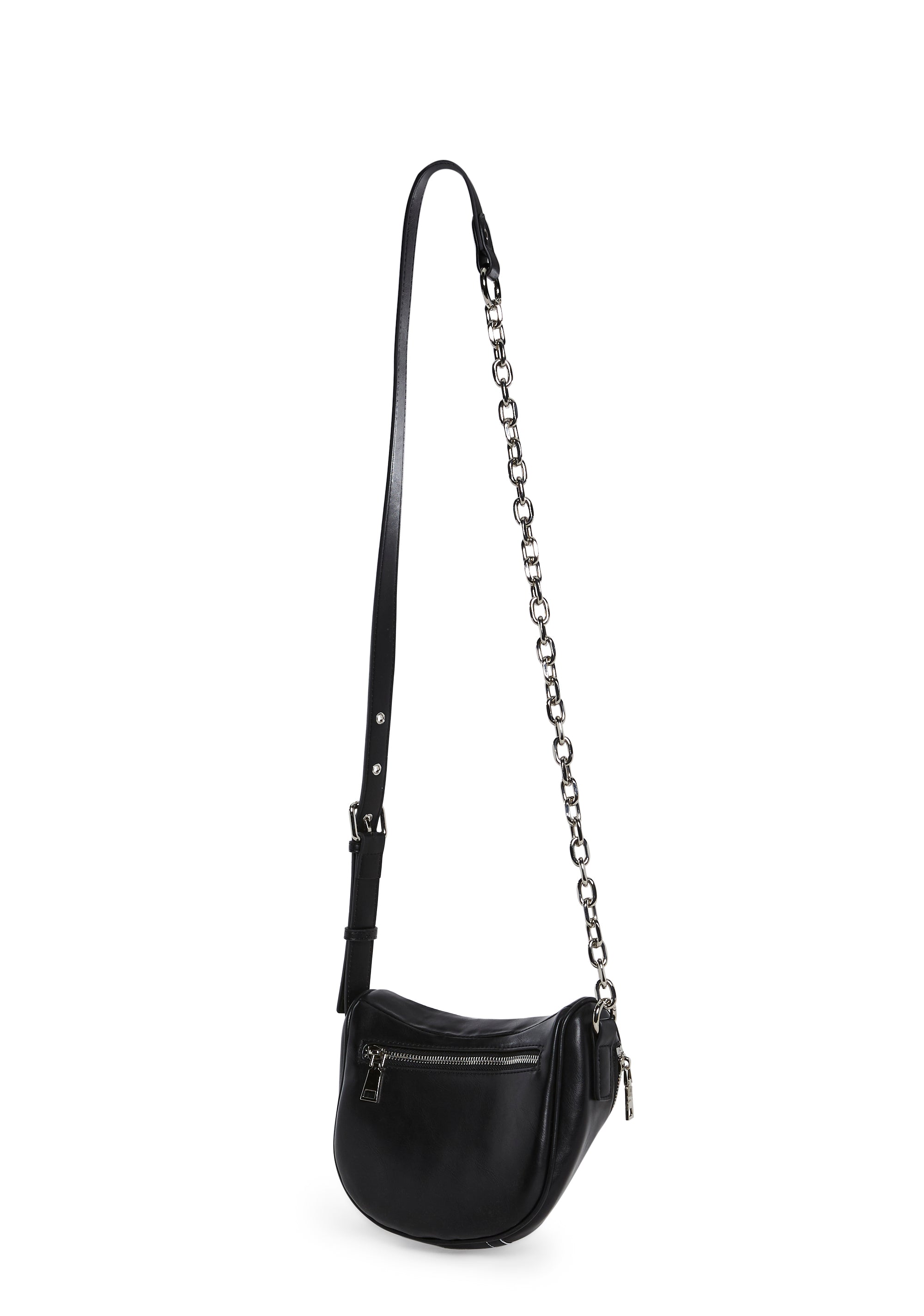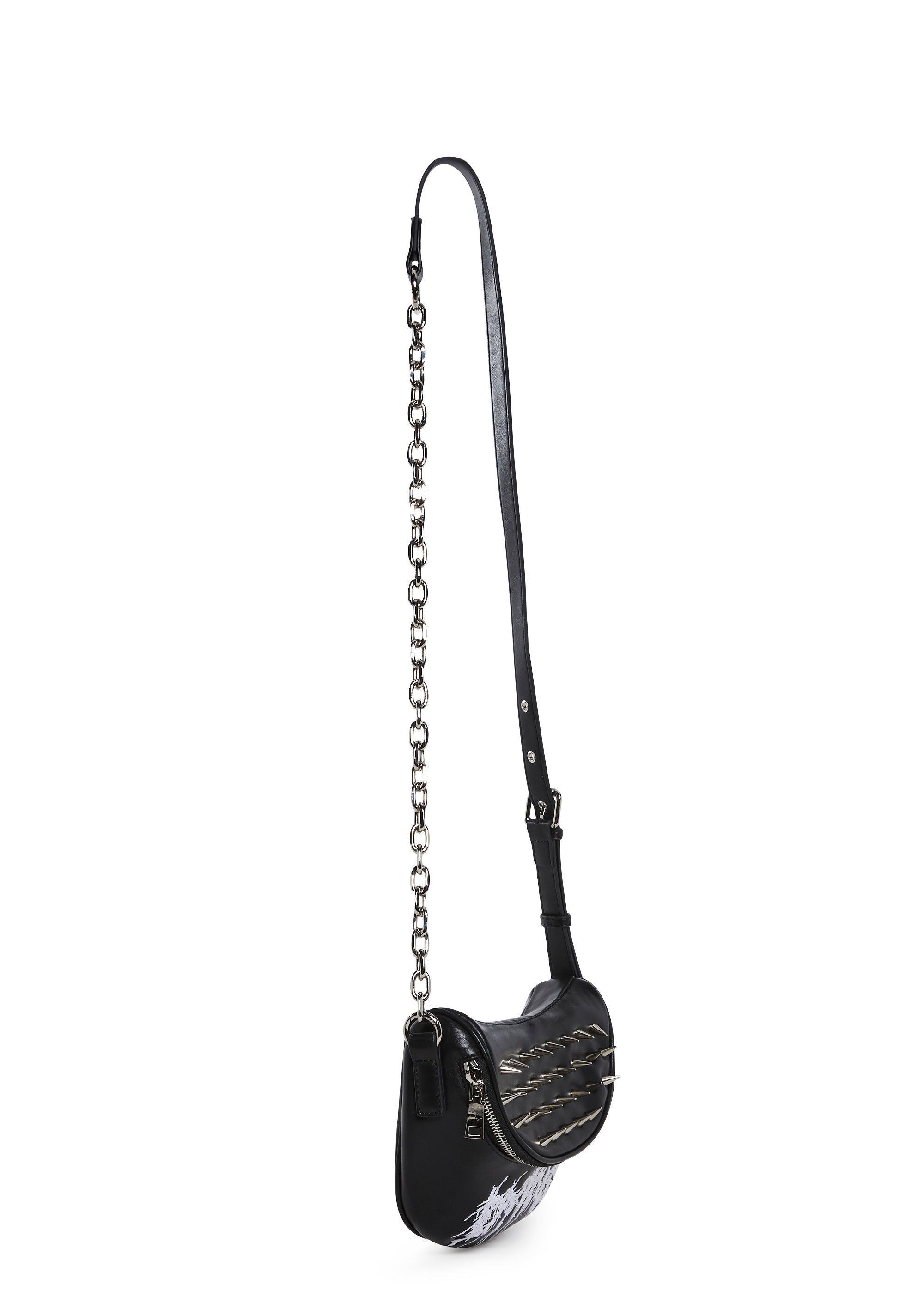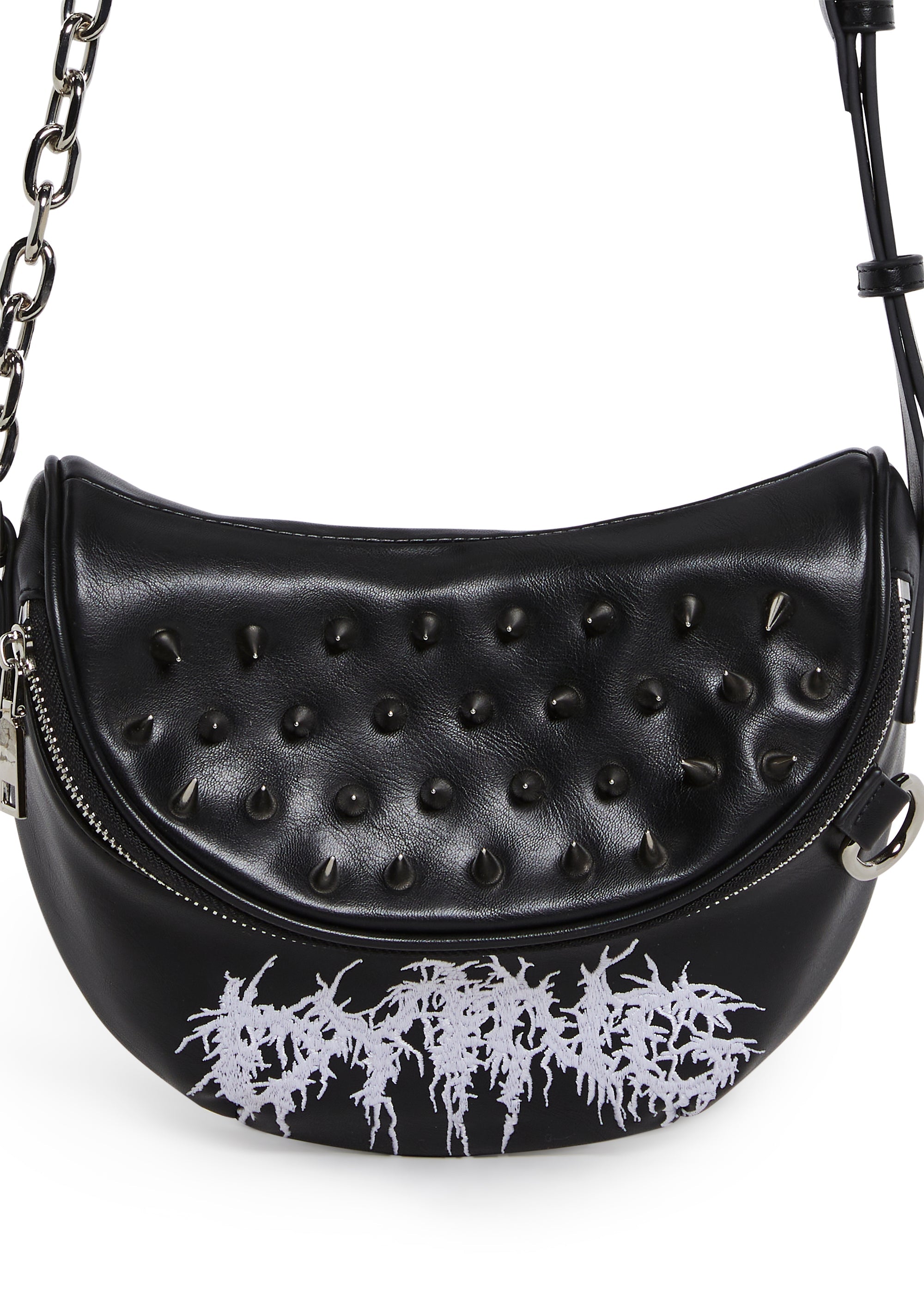 This crossbody bag has a vegan leather construction, interior zippered pockets, D-ring hardware, a back zipper closure, “Dying” embroidered on the front, a zipper closure, spiked details, and an adjustable shoulder strap with chainlinks.