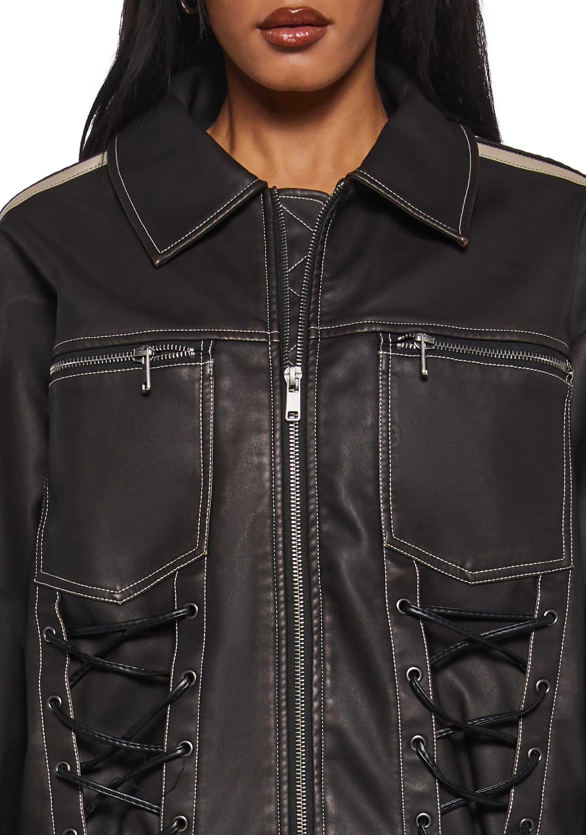 This moto jacket has a washed vegan leather construction, a collared neckline, zippered chest pockets, lace-up details on the front, striped long sleeves with star appliques, zippered cuffs, and a front zipper closure. This product has been pre-washed to create a vintage, worn-in look. Some fabric pilling and sediment may be present in the pocket linings.