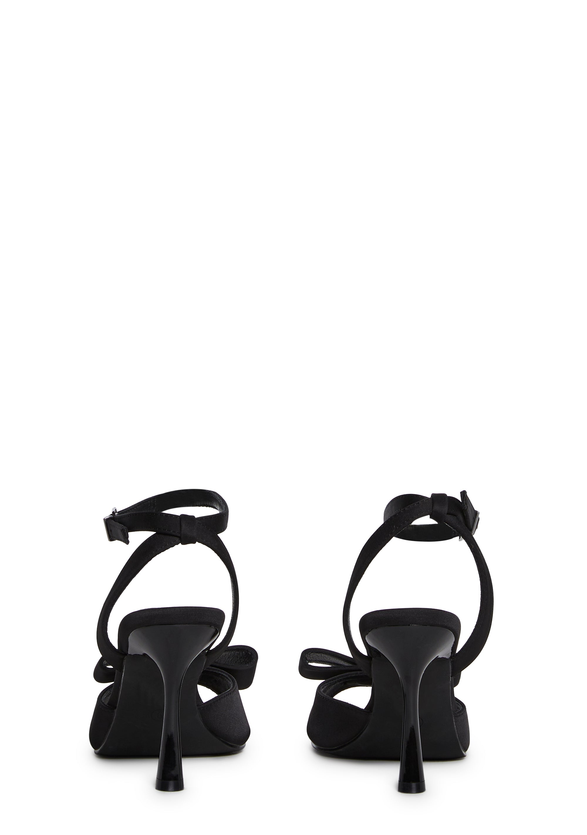 These shoes have a satin construction, a peep toe design, spiked bows on the uppers, and adjustable ankle buckle closures.