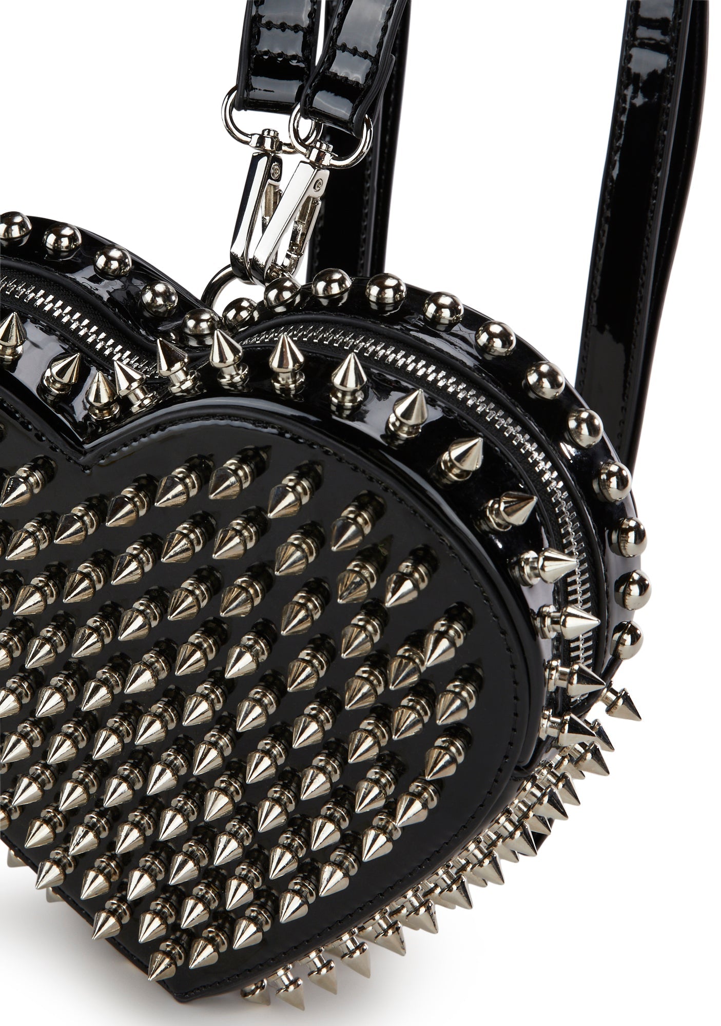cuz your love is fierce and untamed. This backpack has a patent vegan leather construction, a top zip closure, studded embellishments, and adjustable and detachable shoulder straps.