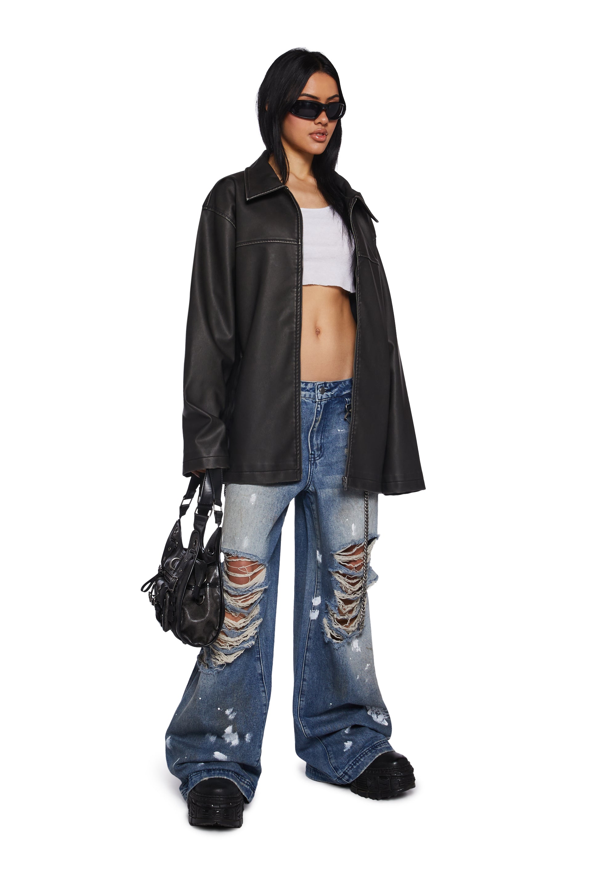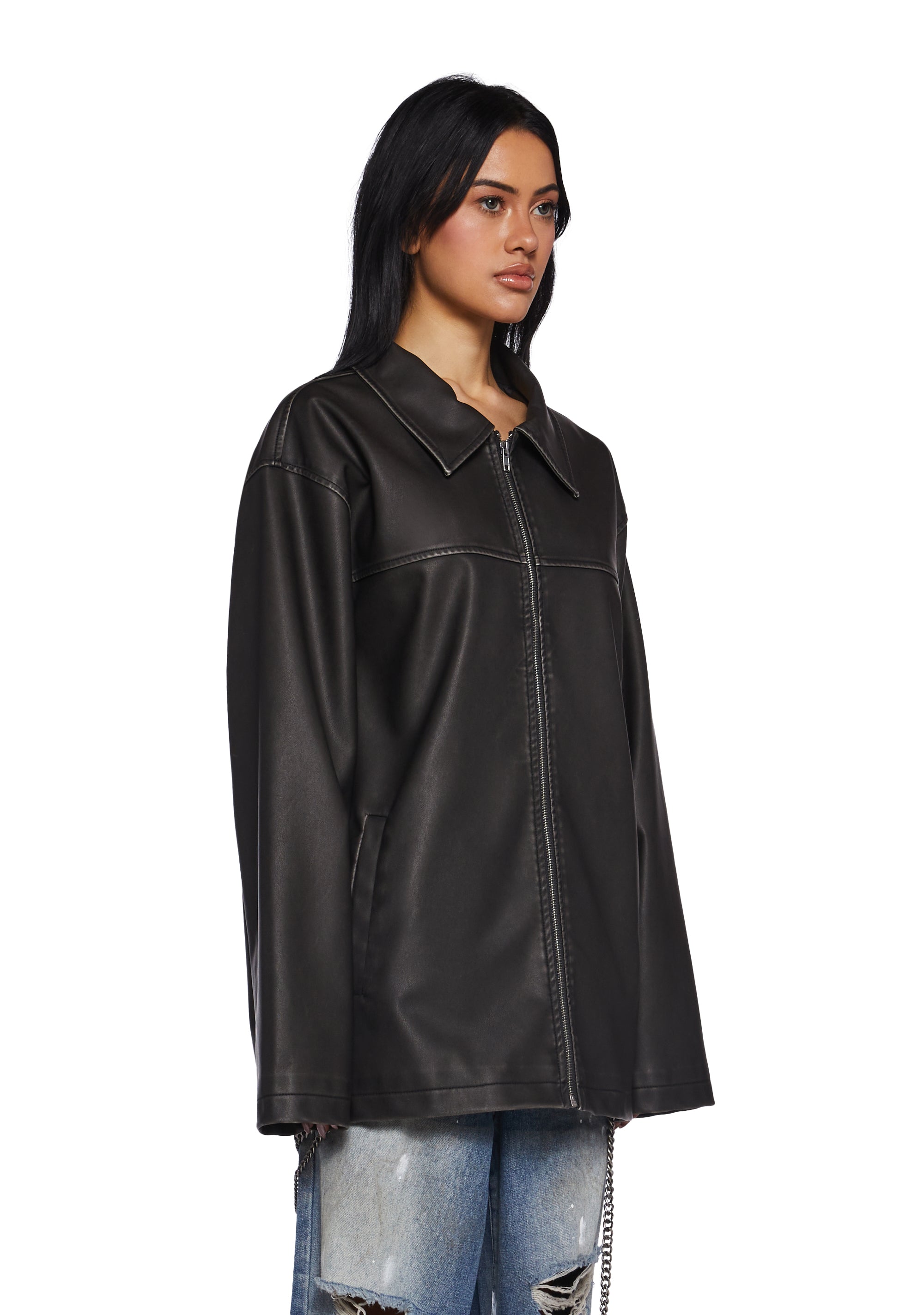 This oversized jacket has a matte vegan leather construction, a collared neckline, pockets, and a front zipper closure.
