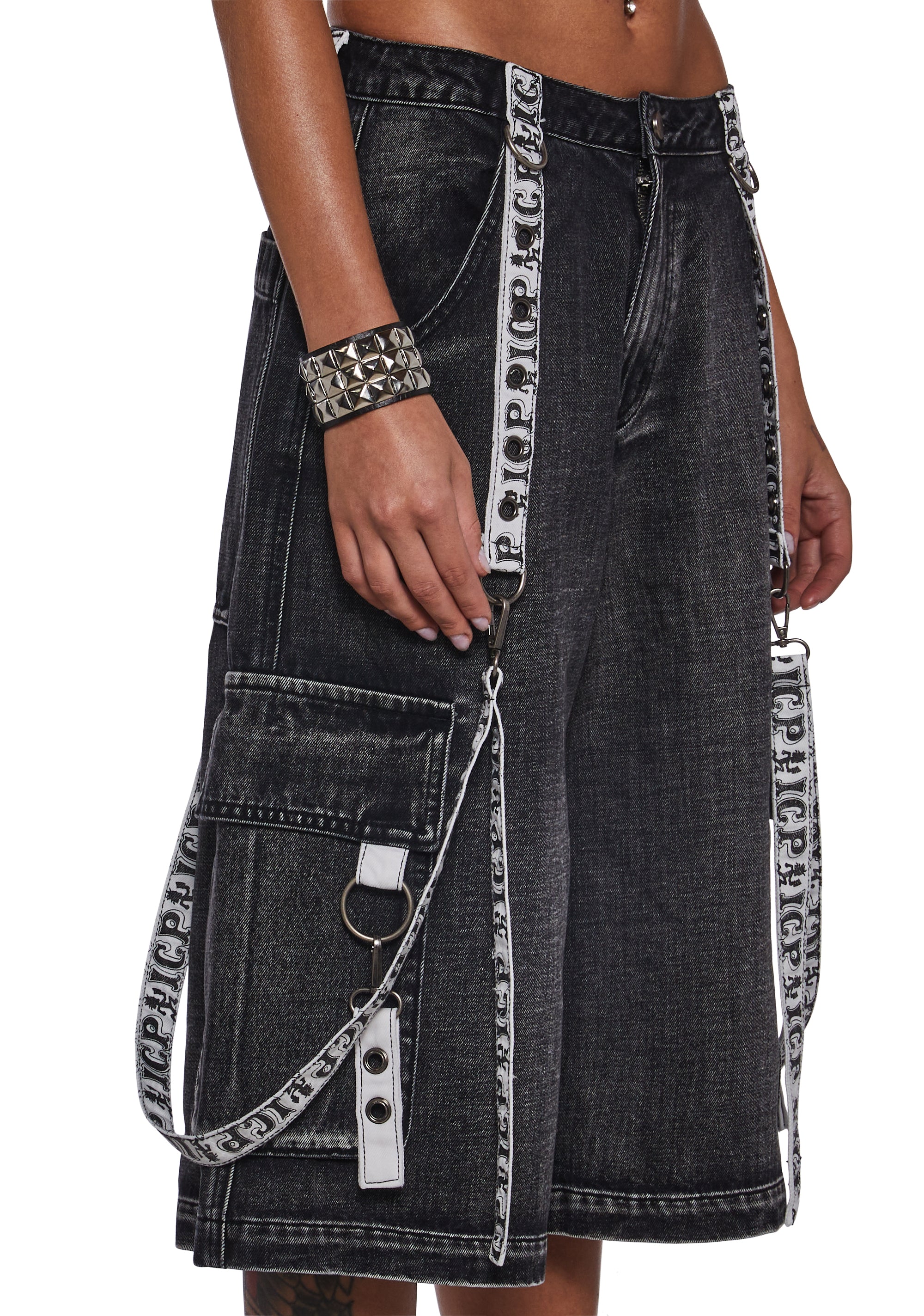 These cargo shorts have a washed denim construction, a wide leg design, O-ring hardware, cargo pockets, detachable ICP logo trill tape details, front and back pockets, and a front button and zipper closure.