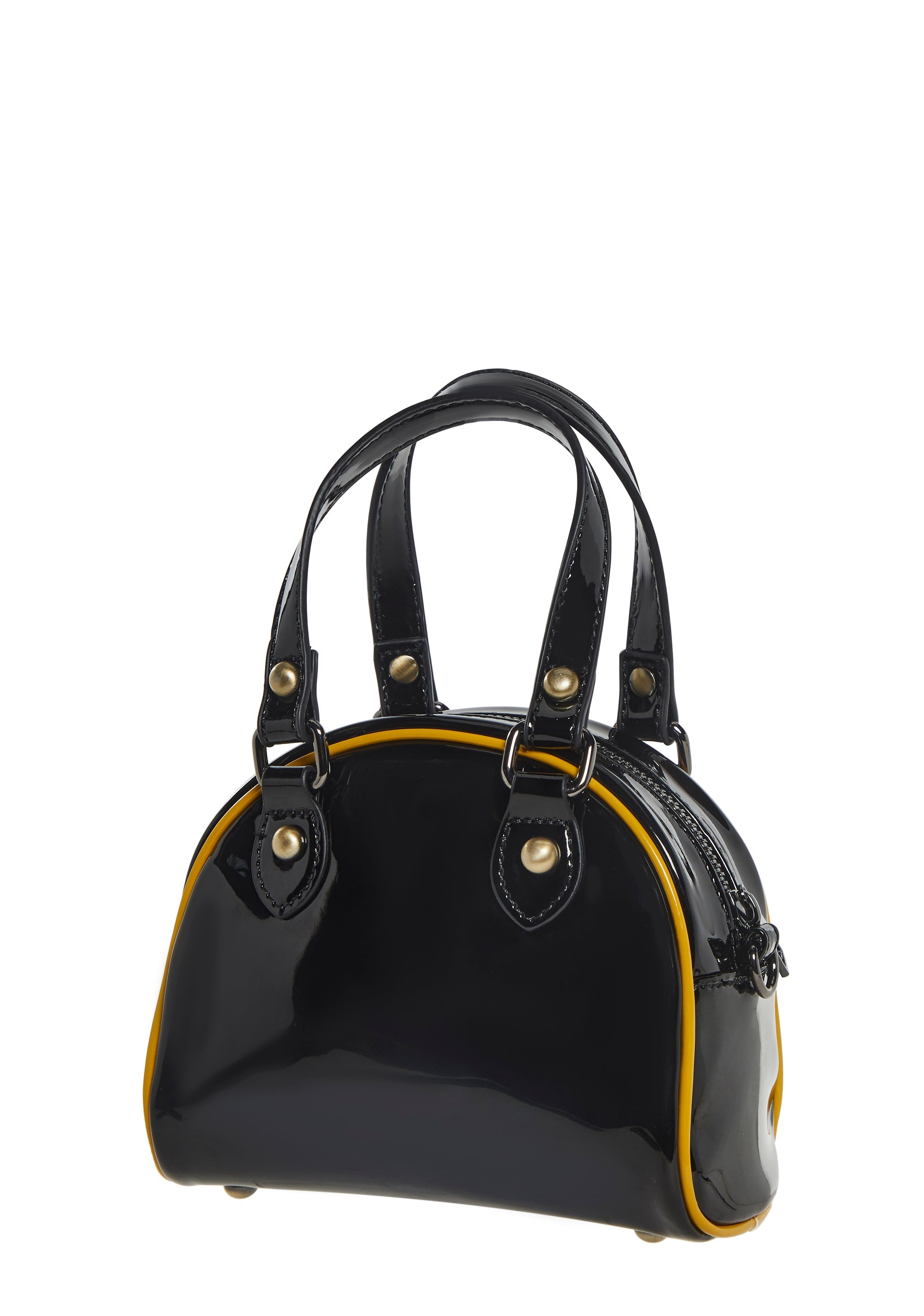 This mini bowler bag has a vinyl construction,"Metal" printed on the front, top handles, a removable adjustable shoulder straps, and a top zipper closure.