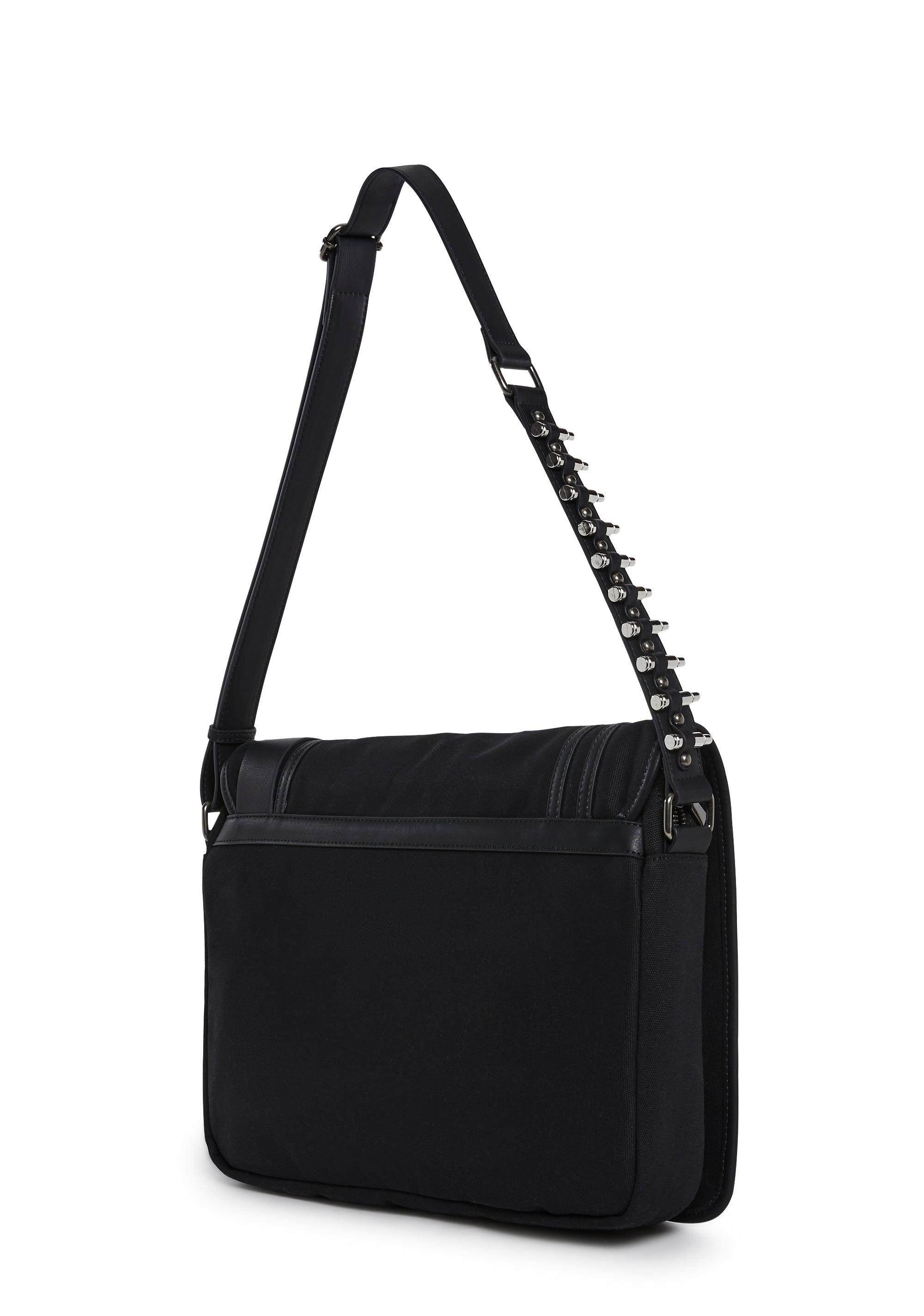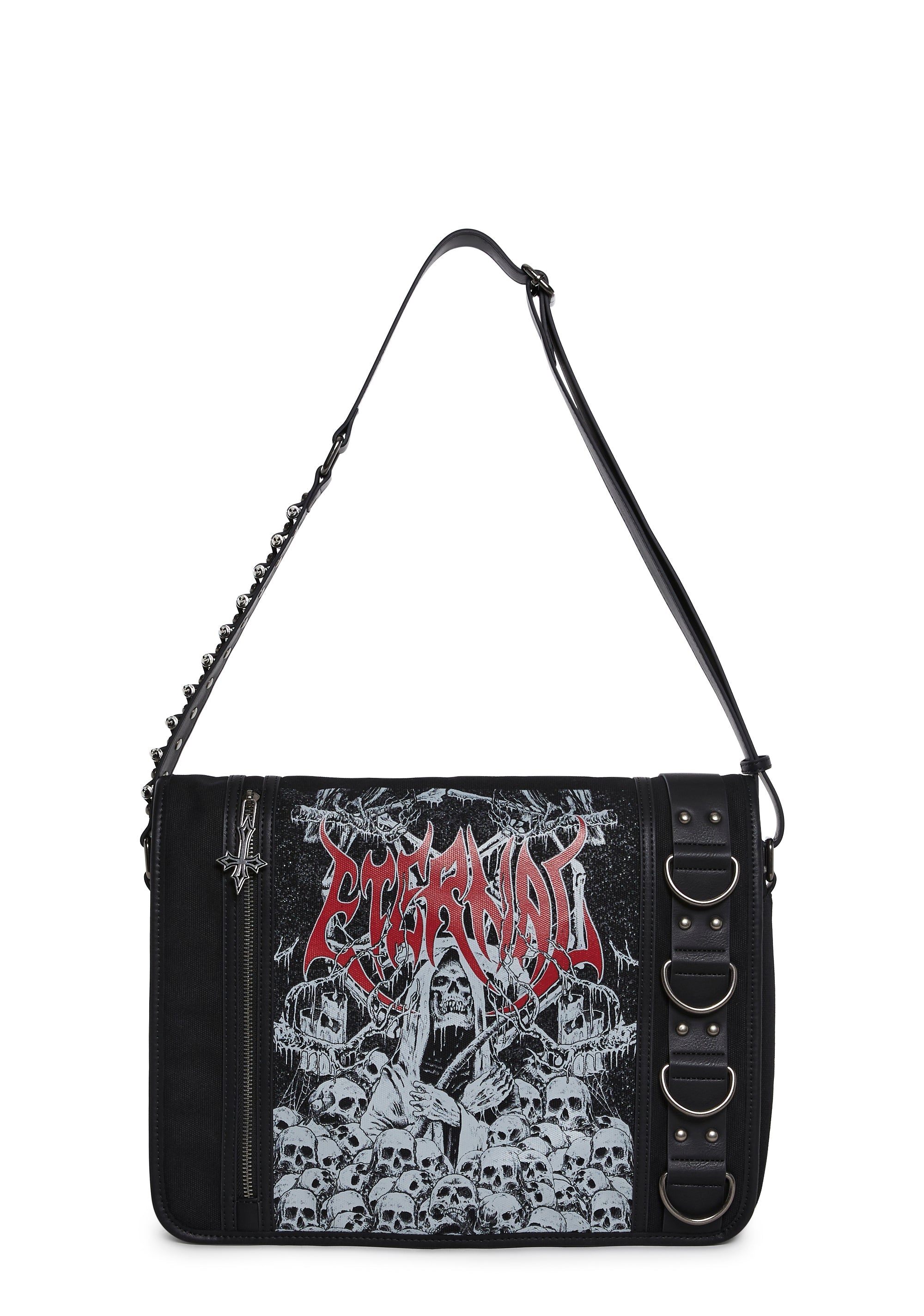 This bag has a canvas construction, a top zipper closure, a flap with velcro closures, the flap has a graphic of a skull graveyard with the grim reaper in the center, “Eternal” printed in the center, a front zipper closure with a cross charm, D-ring and stud details, a hidden pocket, and an adjustable vegan leather shoulder strap with decorative bullets on the sides.