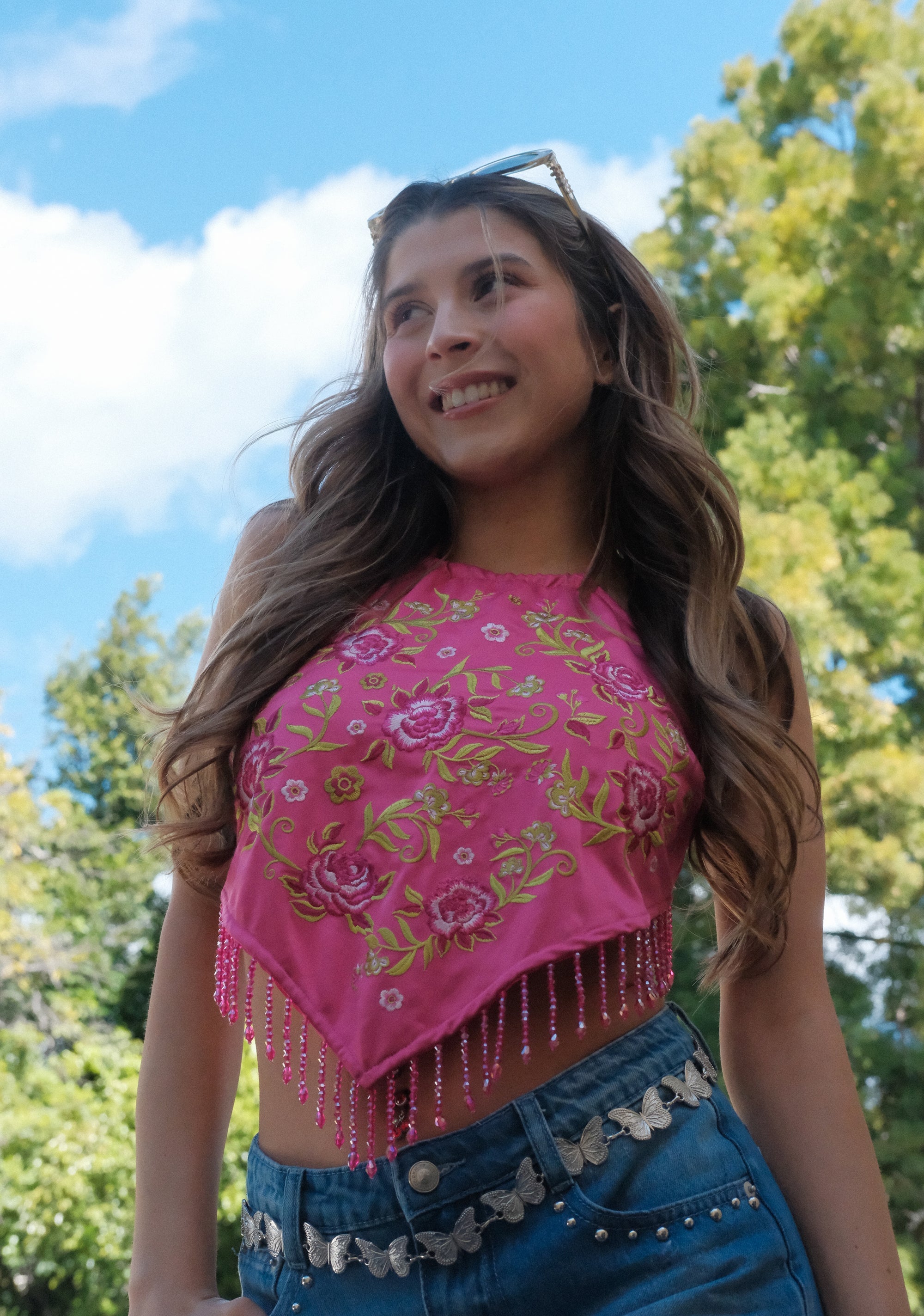 Get on the same wavelength with this top has a satin construction, embroidered floral details on the front, a beaded fringe, a pointed hem, a halter neckline, and an open back with adjustable back tie closures.