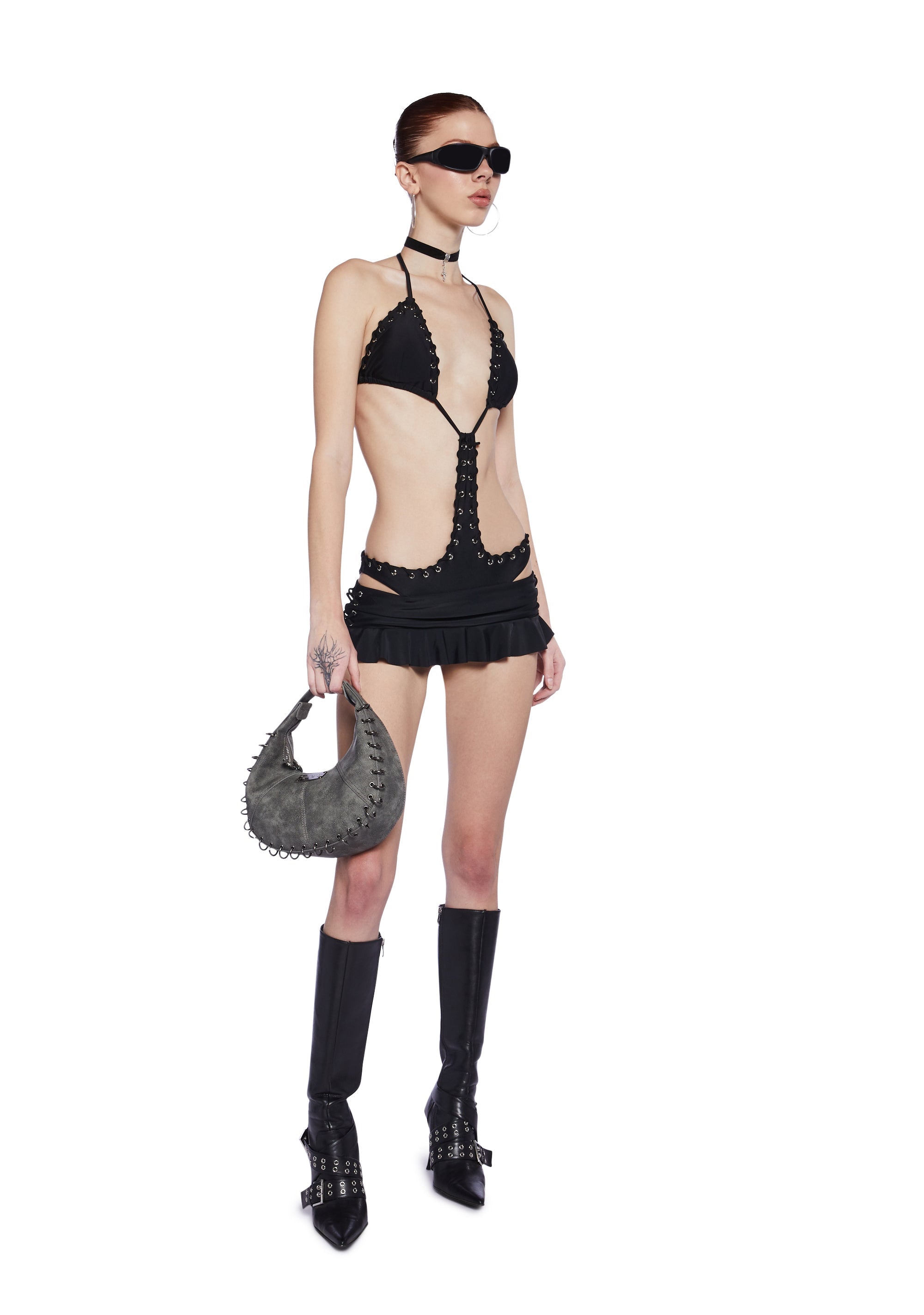 cuz make that turn on the catwalk. This monokini has a grommet and lace up design, a halter neckline, adjustable back tie closures, and comes with a removable pleated micro mini skirt with adjustable lace-ups on the sides.