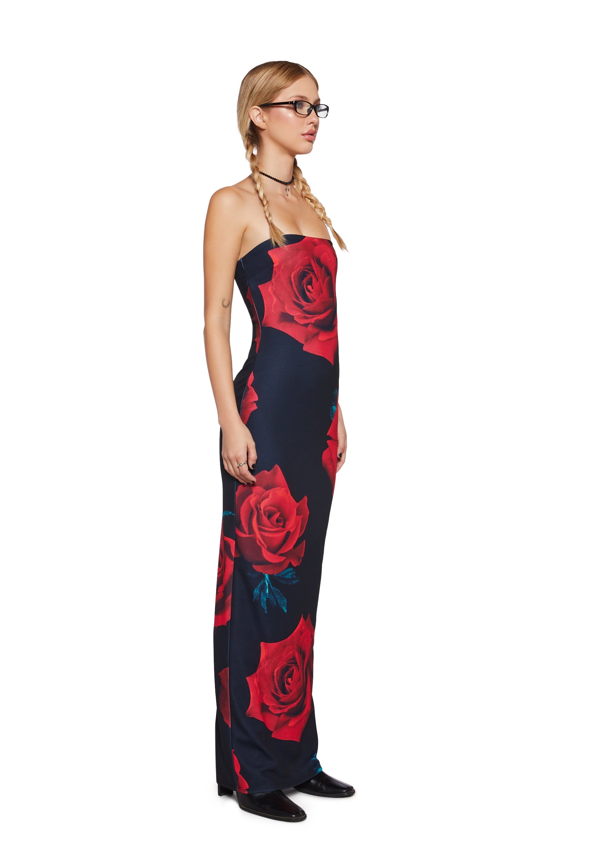 This maxi dress has a stretchy knit construction with a strapless design, an all-over rose print, and a back zipper closure.