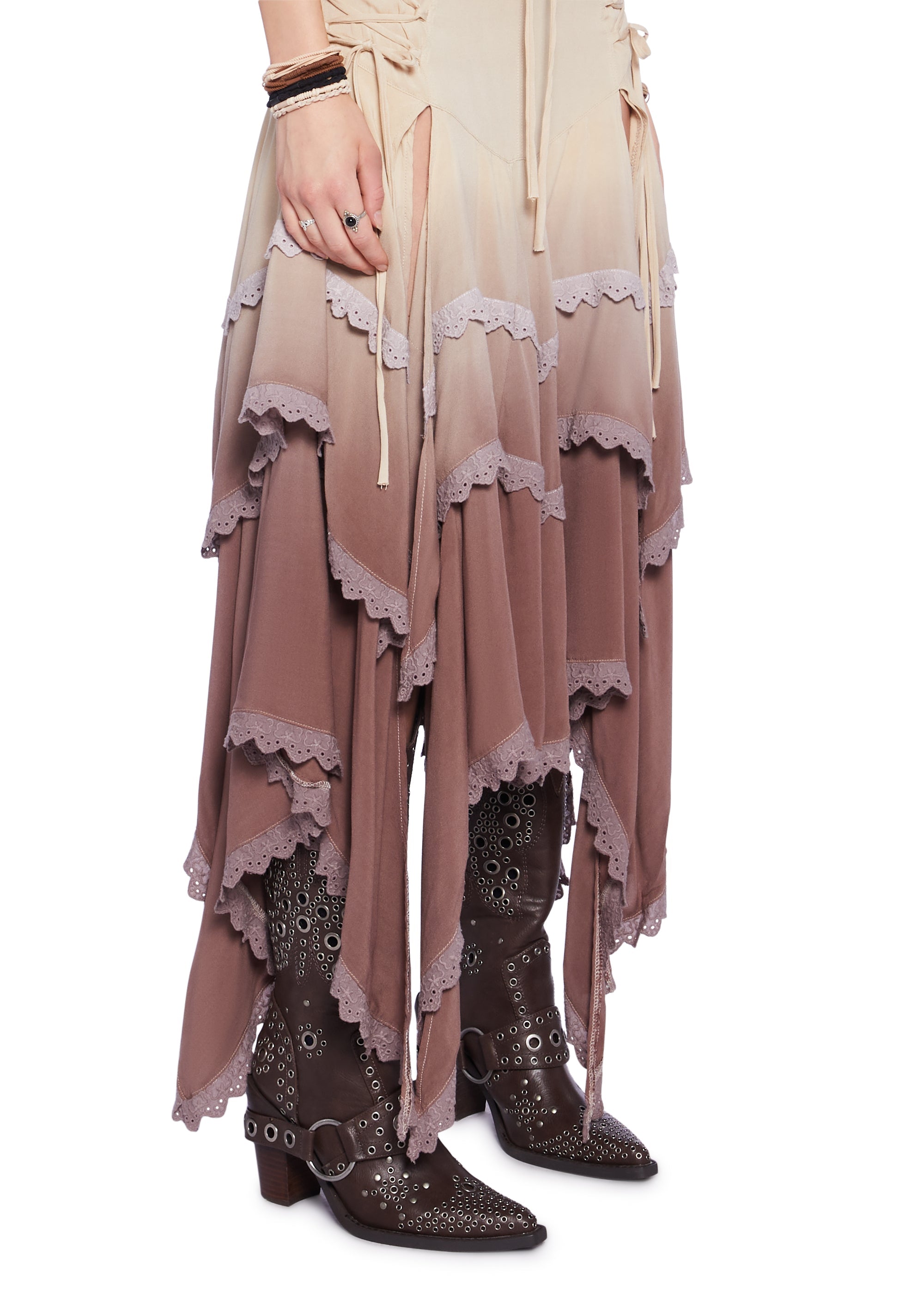cuz you are a wildflower in a sea of roses. This set has a stretchy knit construction with a dip dye design, a cami crop top with self-tie shoulder straps, a shirred back, lace-up front detail, and a maxi skirt with a lace-up front design, a handkerchief hem with eyelet lace trim, front slits, and a back zipper closure.