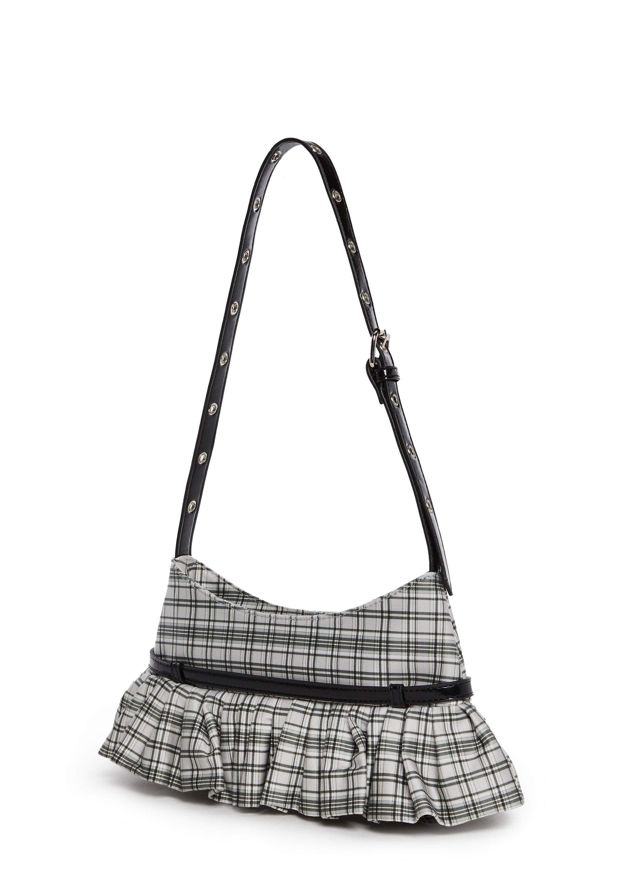 This skirt inspired shoulder bag has an all over plaid print, a decorative vinyl strap, an adjustable vegan leather shoulder strap, and a top zipper closure.
