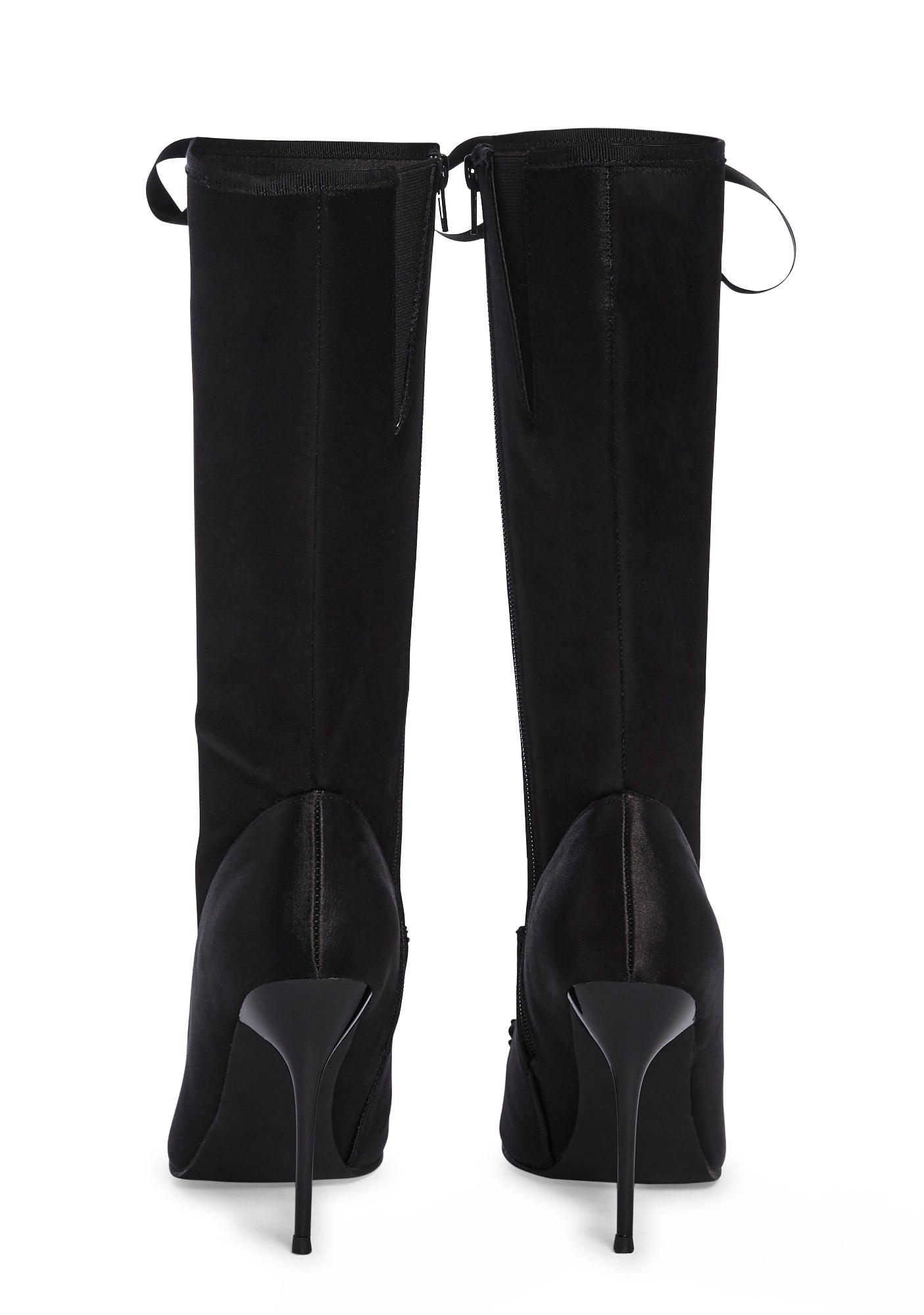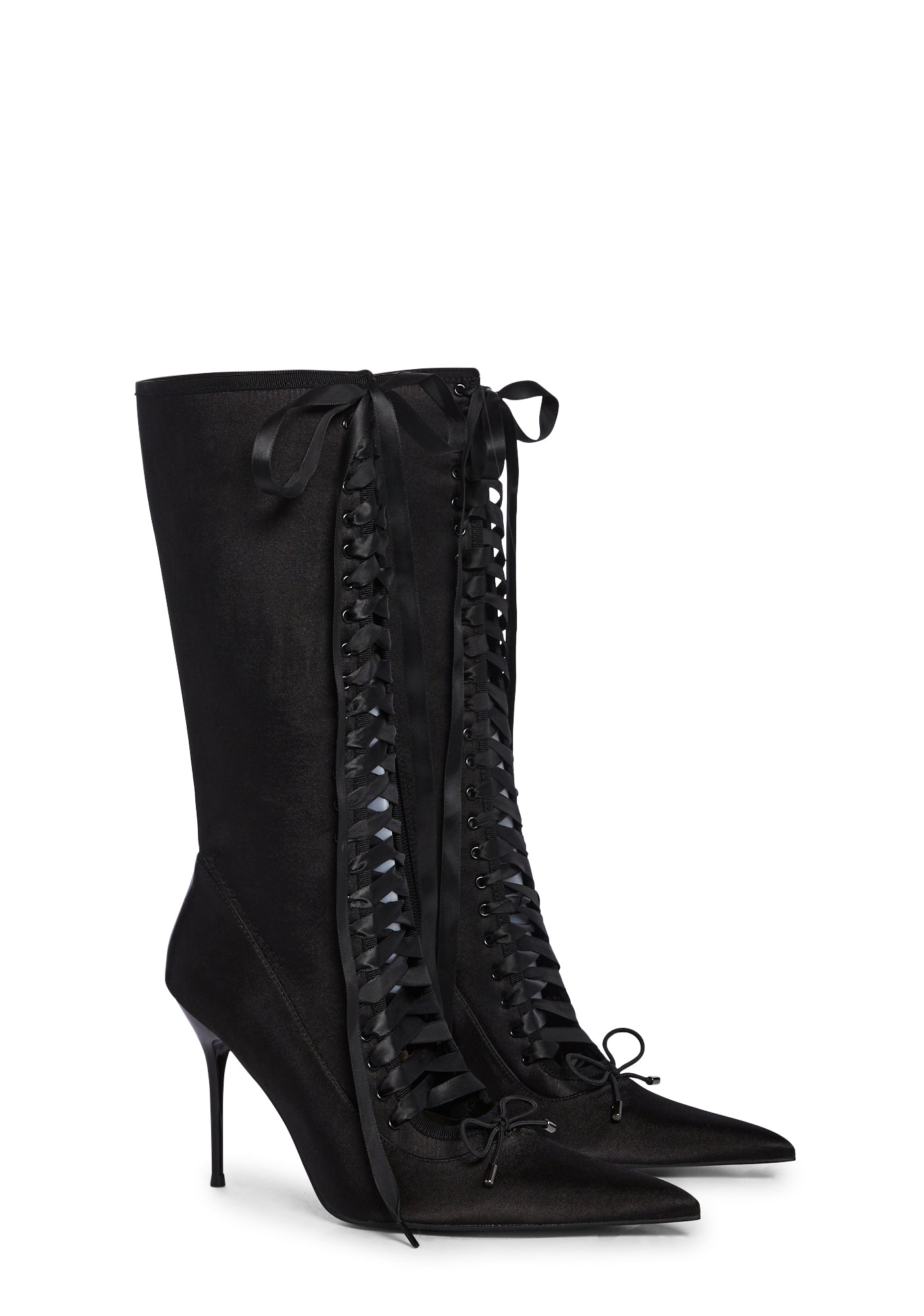 cuz your lips are sealed. These boots have a pointed toe design, a satin construction, stiletto heels, bows on the uppers, a front lace-up design, and side zipper closures.