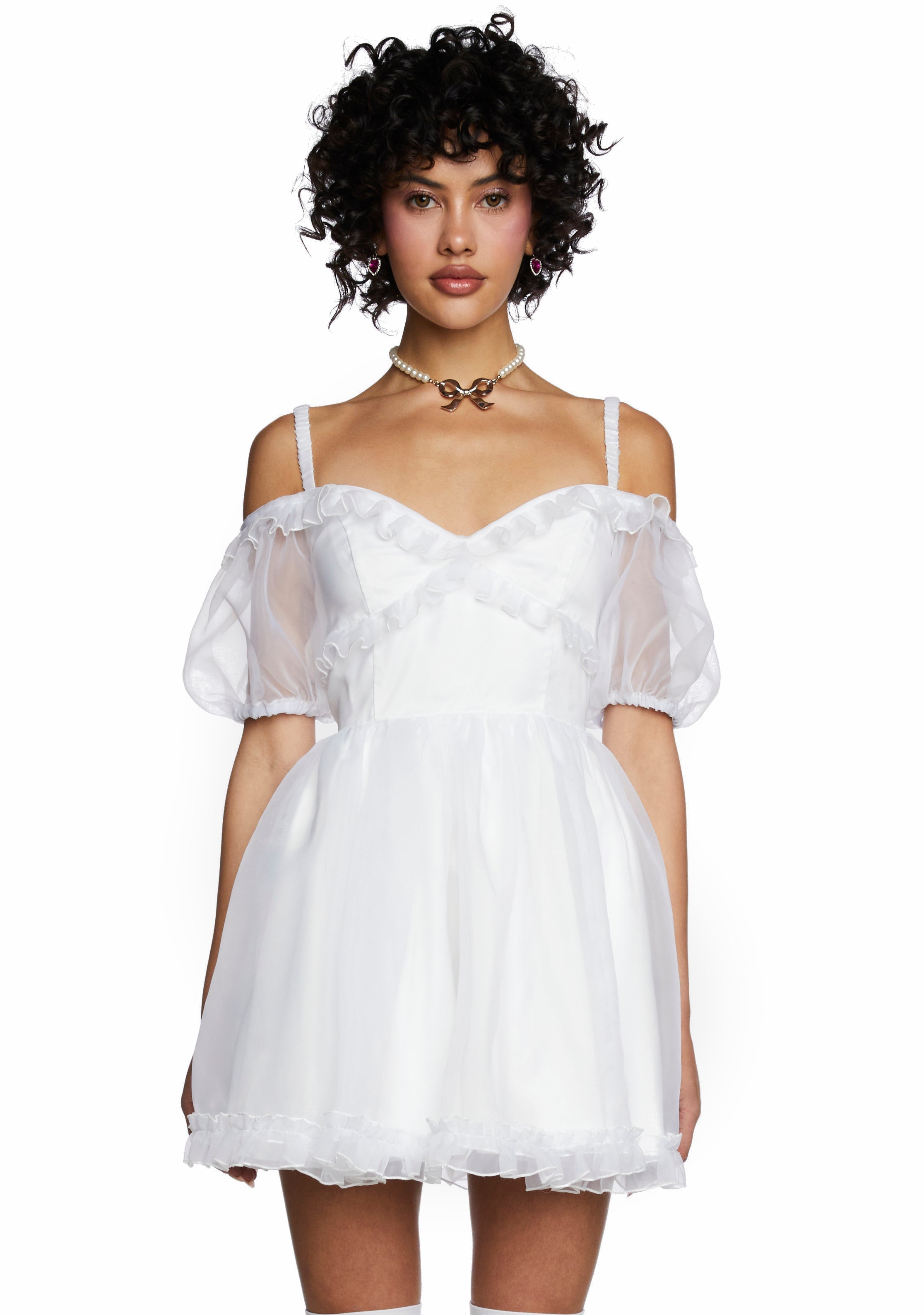 BRB, stepping into a Jane Austen novel. This mini dress has a non-stretch organza construction, elastic shoulder straps, short puff off-the-shoulder sleeves, ruffle trim, adjustable satin lace-up ties at back, and a side zip closure.