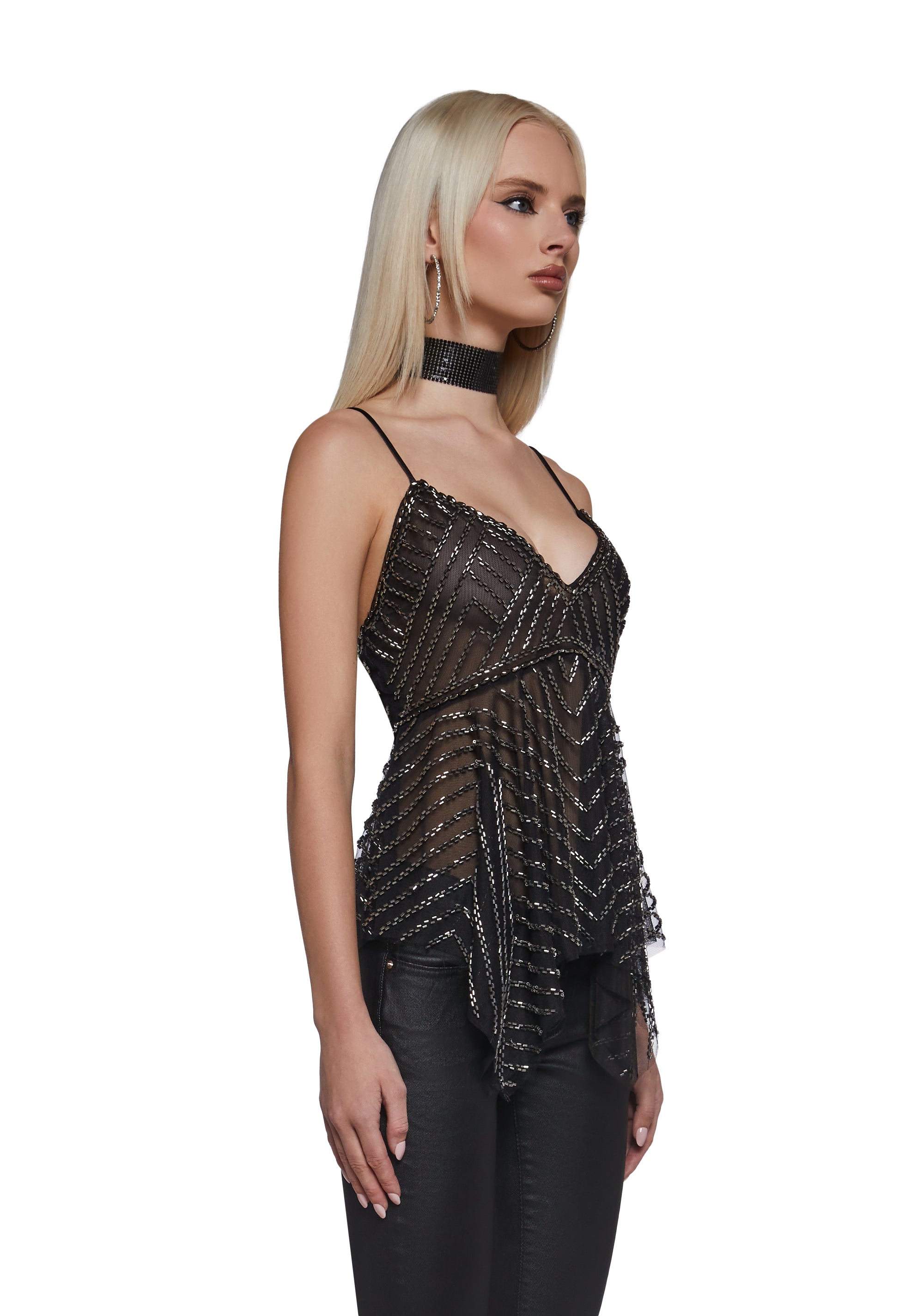 Turn heads in this sheer embellished cami top designed with intricate bead detailing and a layered, flowing hem for dramatic movement. Delicate yet bold, this piece creates a striking balance between elegance and edge.