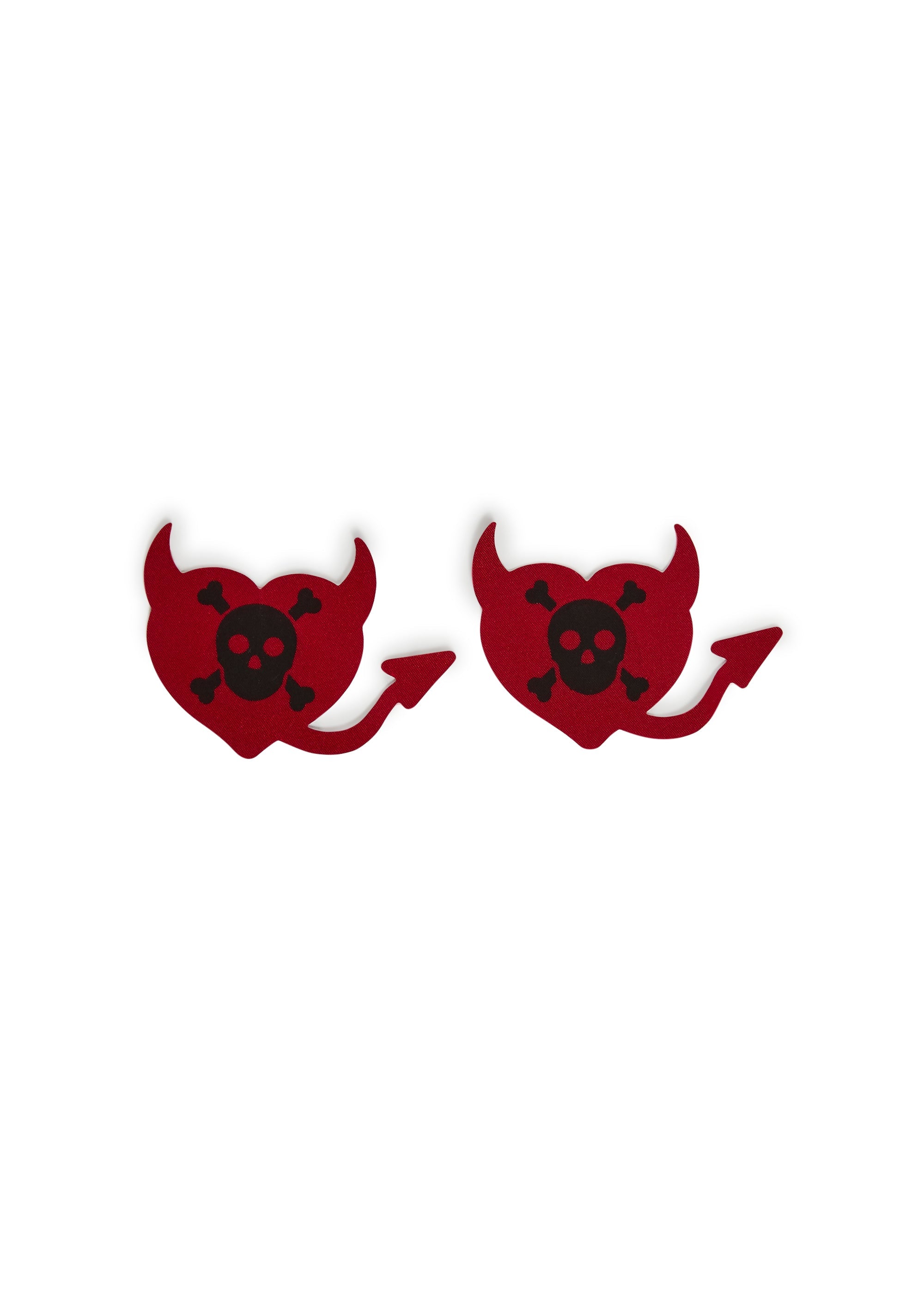 These heart-shaped pasties have a skull and crossbones print, devil horns and tail, and a self-adhering application.
