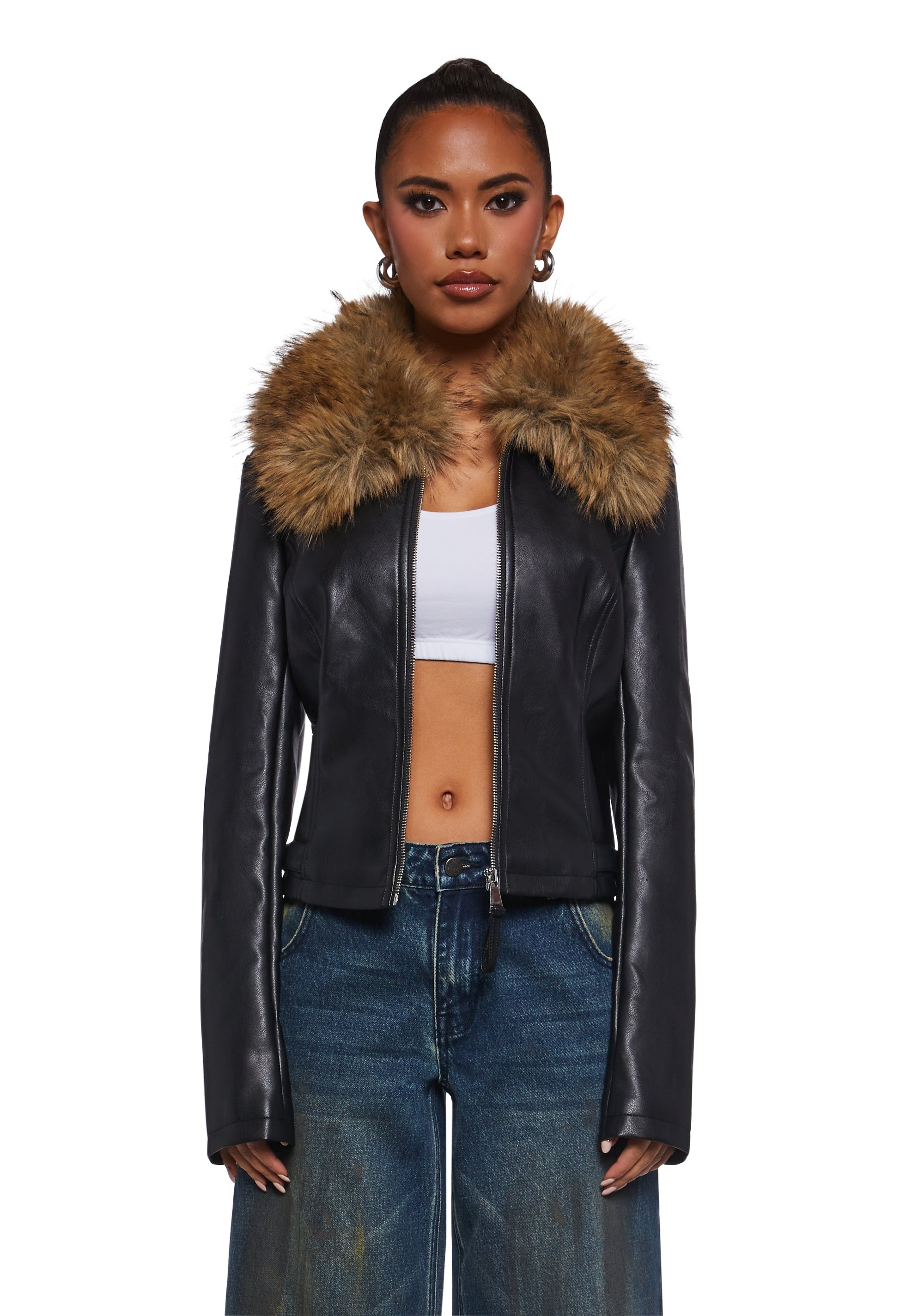 This jacket has a vegan leather construction, a faux fur collared neckline, and a front zipper closure.