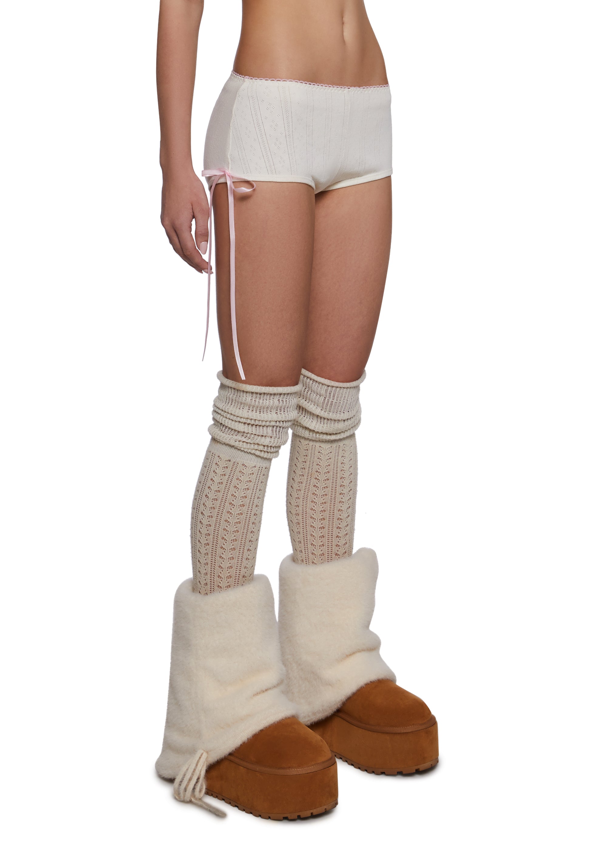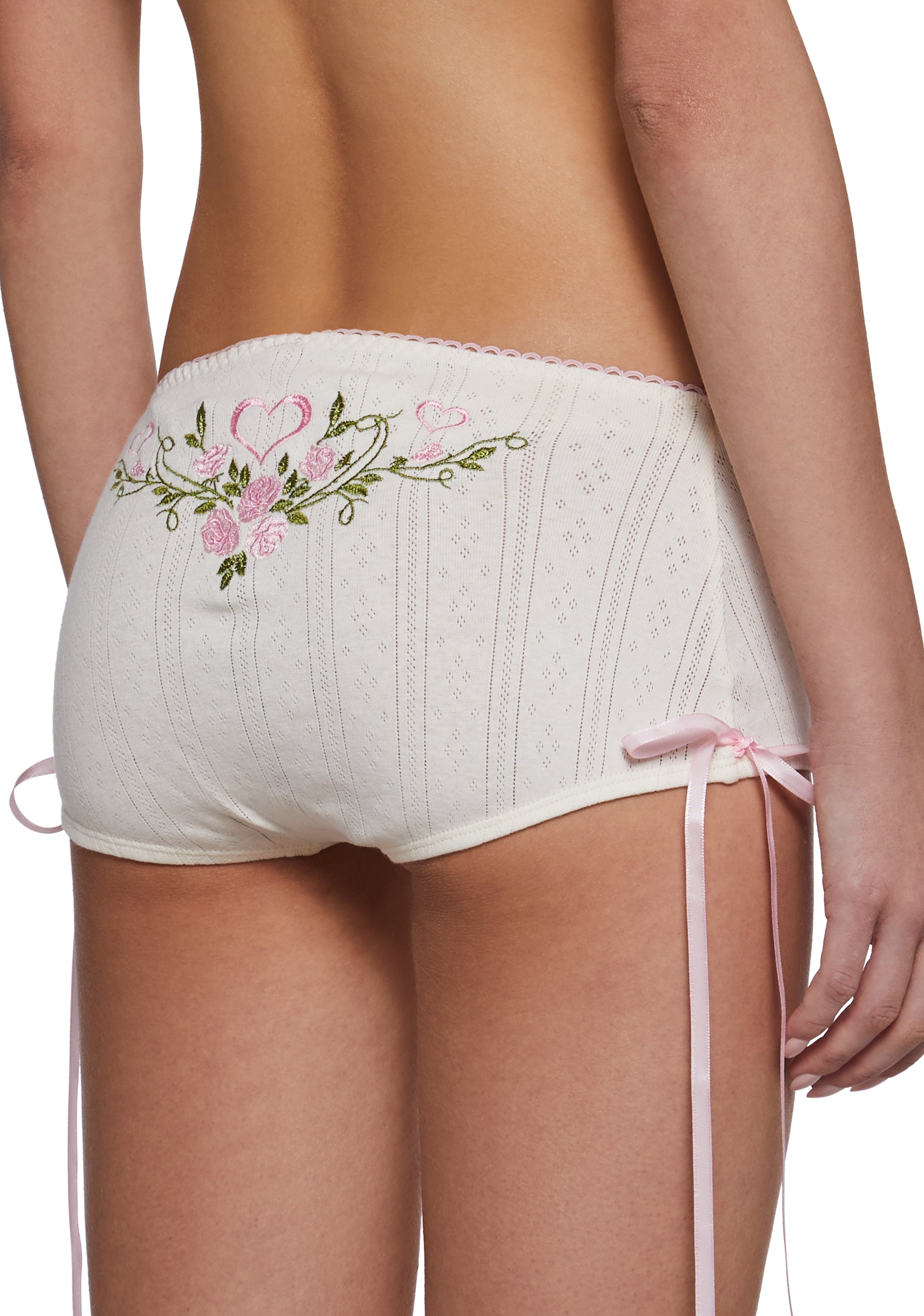 These low-rise pointelle shorts blend comfort and charm with a playful, girly edge. Featuring delicate embroidery and side ribbon ties, they’re designed for a flattering fit that feels effortlessly cute and cozy.