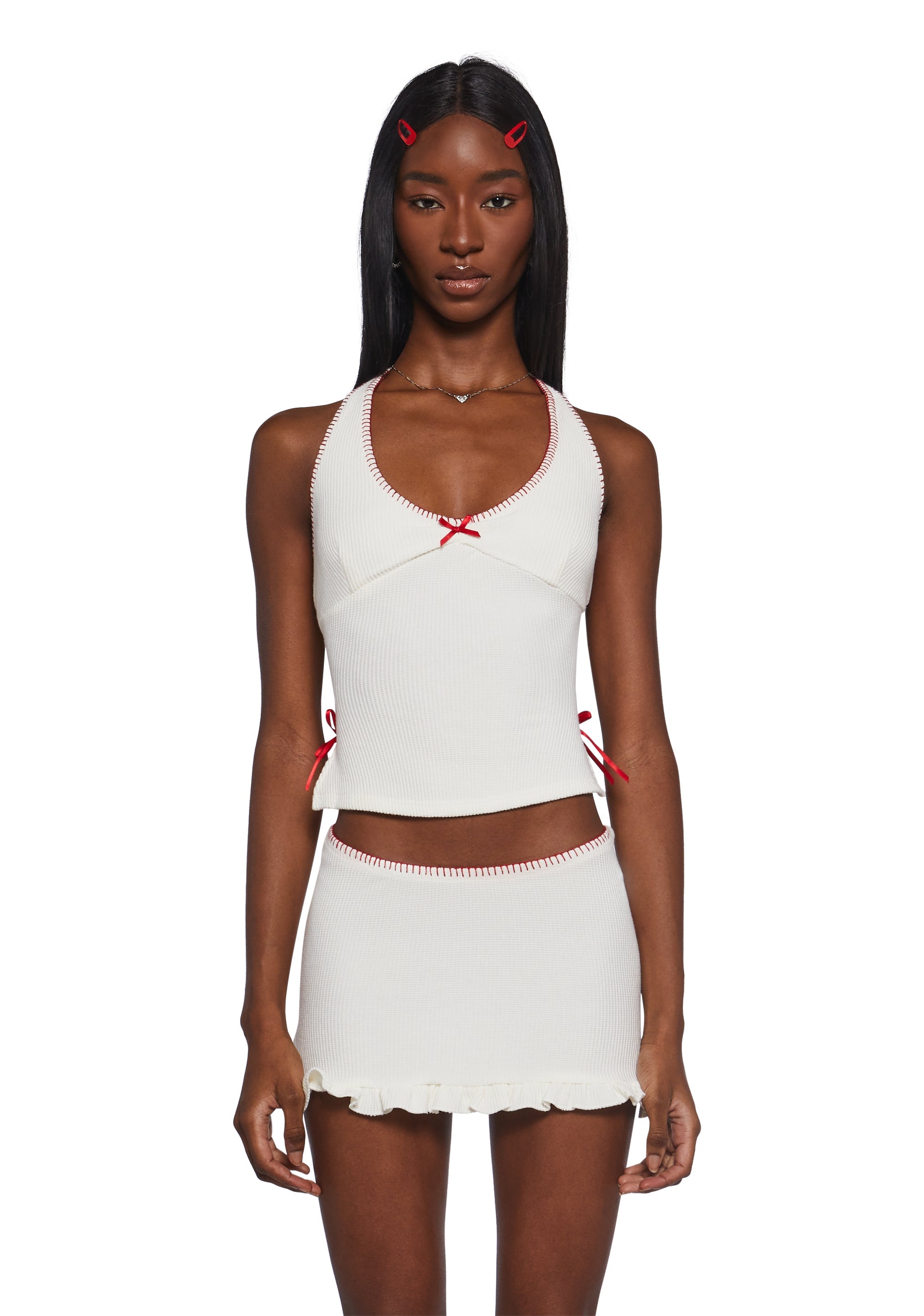 This set includes a halter top that has a knit ribbed construction, constrast colored stitching, adjustable back tie closures, decorative red ribbon bows, and a matching skirt with a ruffled hem.