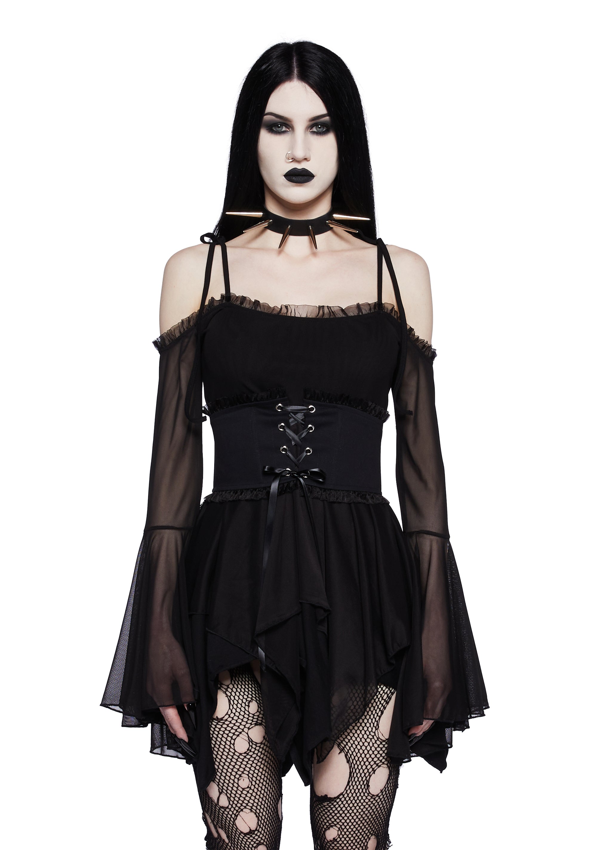 like someone magical. This mini dress comes with off the shoulder mesh sleeves, spaghetti straps with tie closures, a detachable corset with front lace ups and a lace trim, and a handkerchief detail, hem, and cuffs.