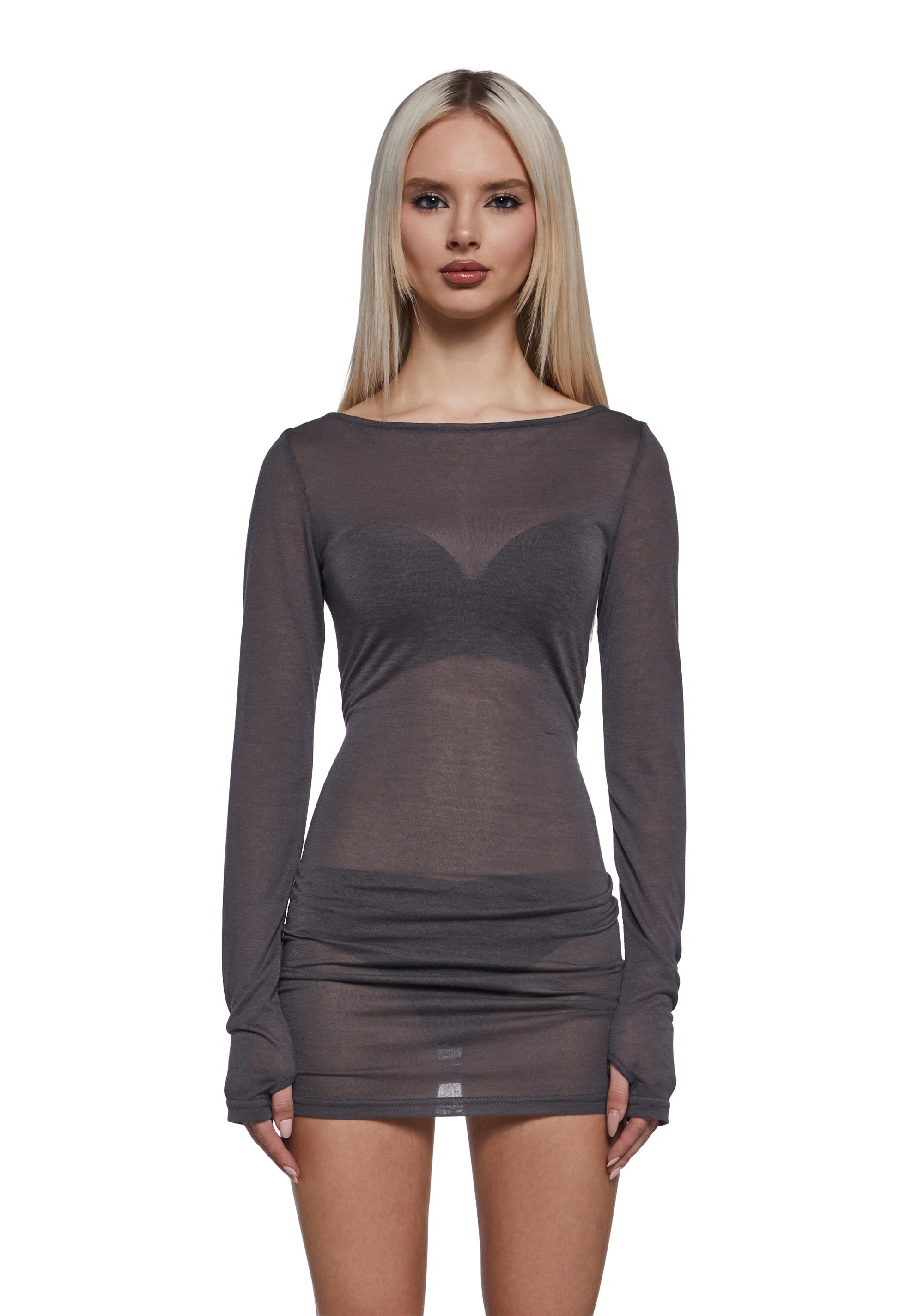 Slip into sleek, effortless style with this sheer mini dress designed to softly hug your curves. Crafted from lightweight stretch mesh, this piece delivers a modern, barely-there look perfect for layering or bold solo styling.