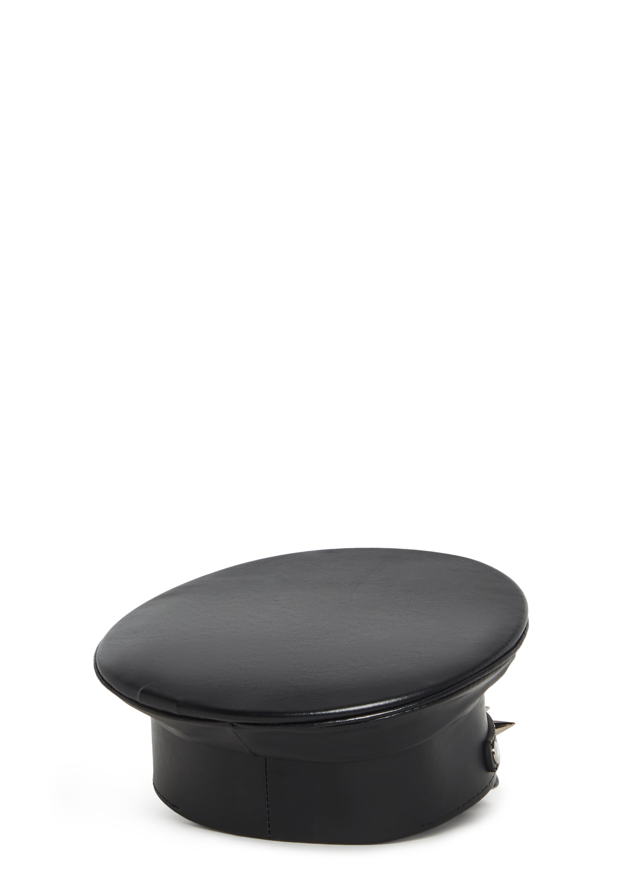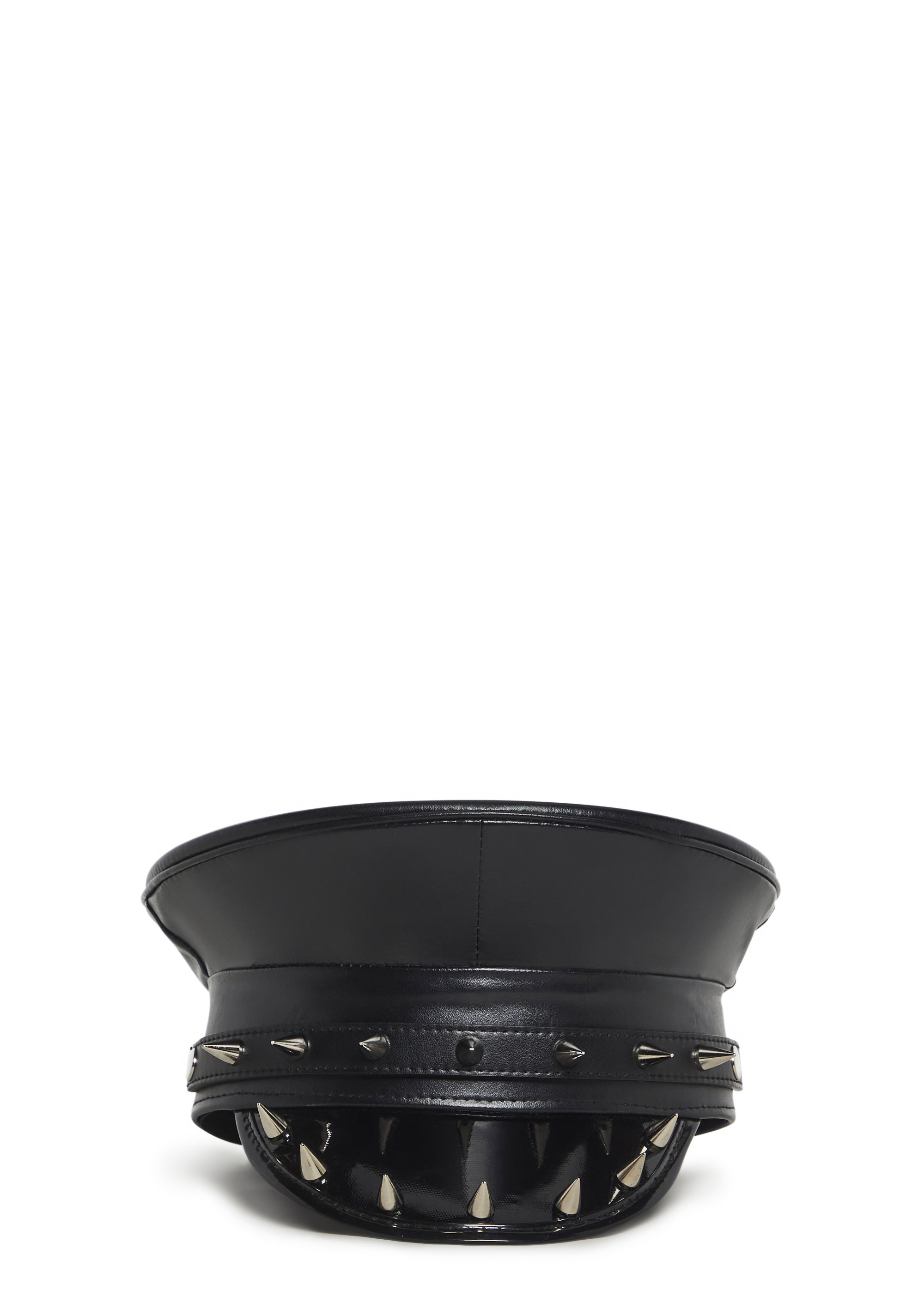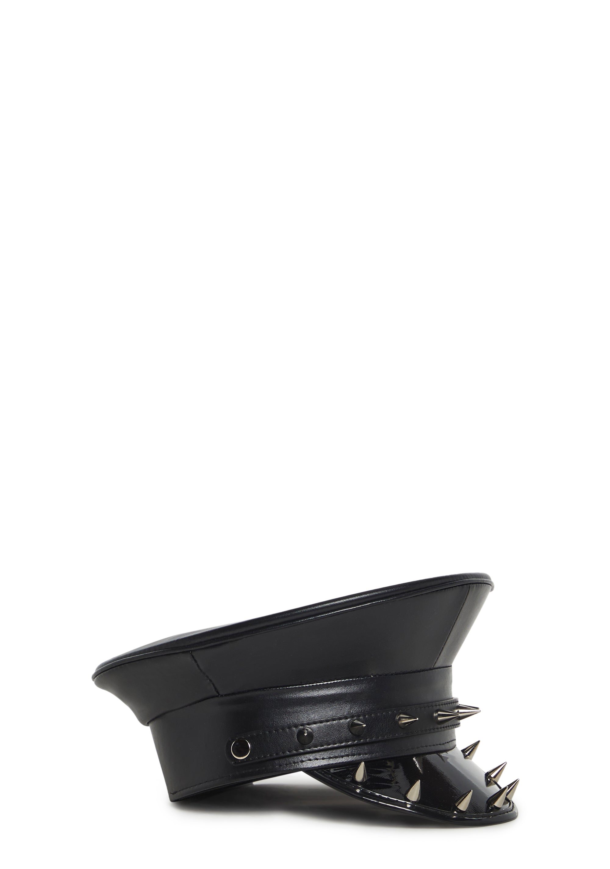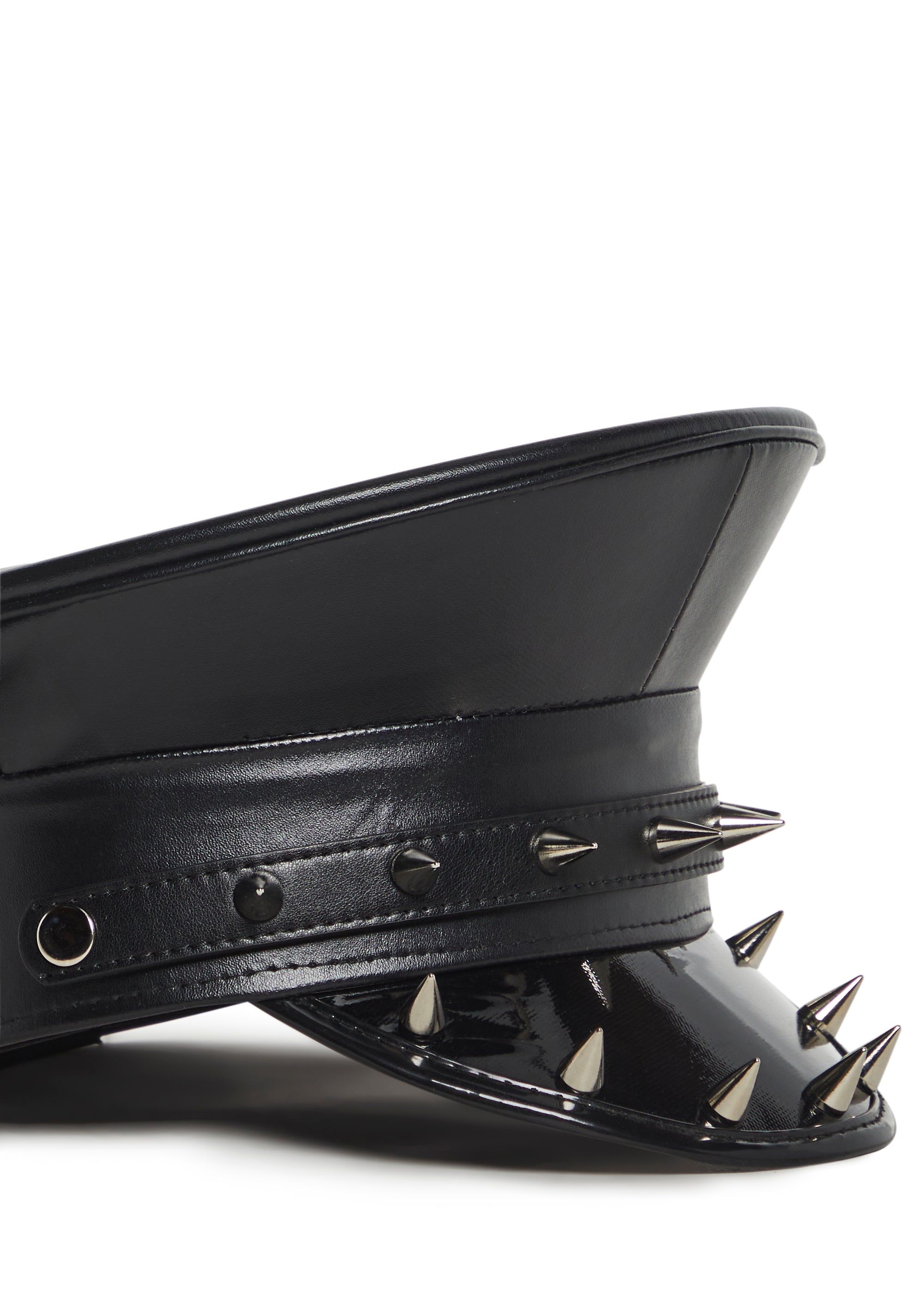 This captain hat has a vegan leather construction, a vinyl brim, and metal spikes on the front and brim.