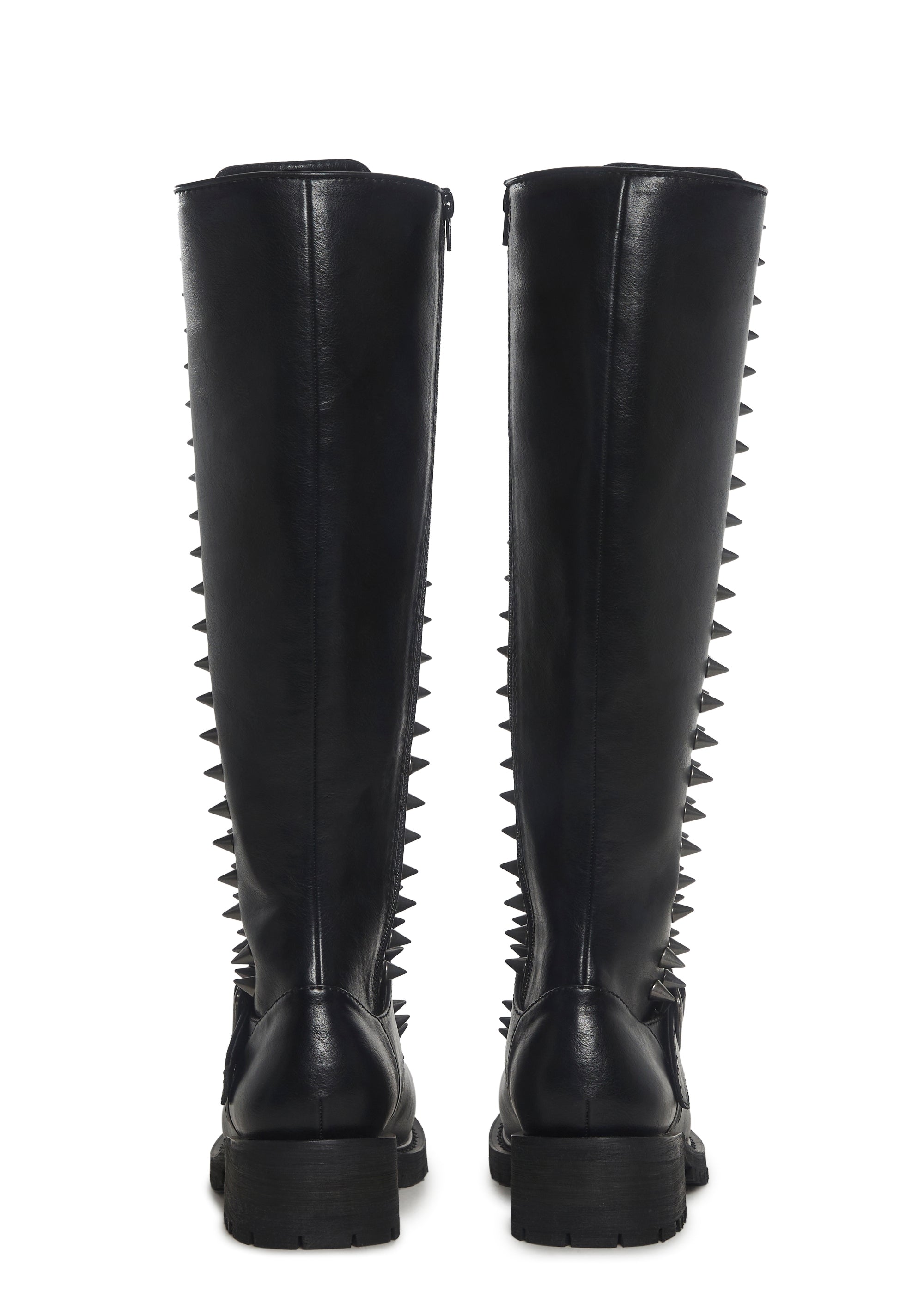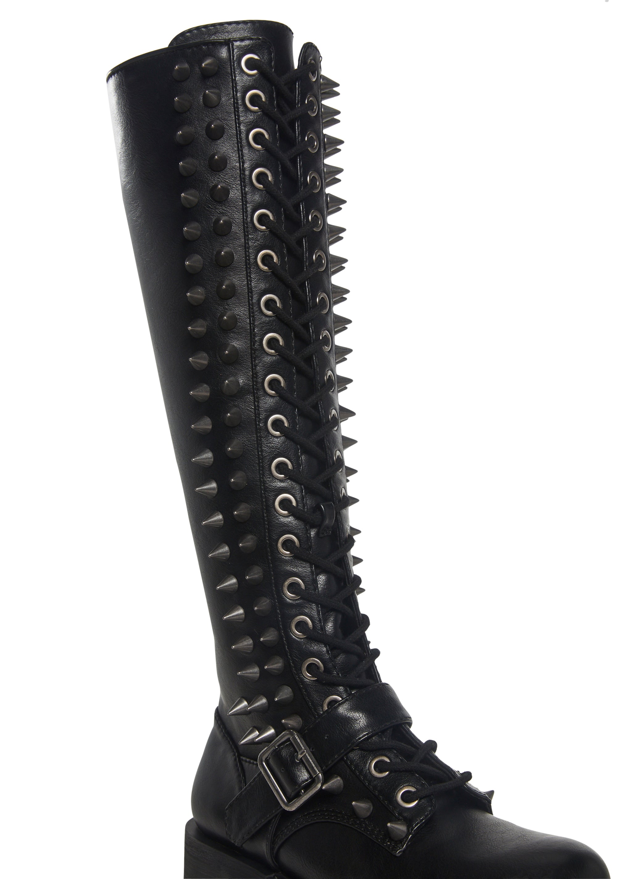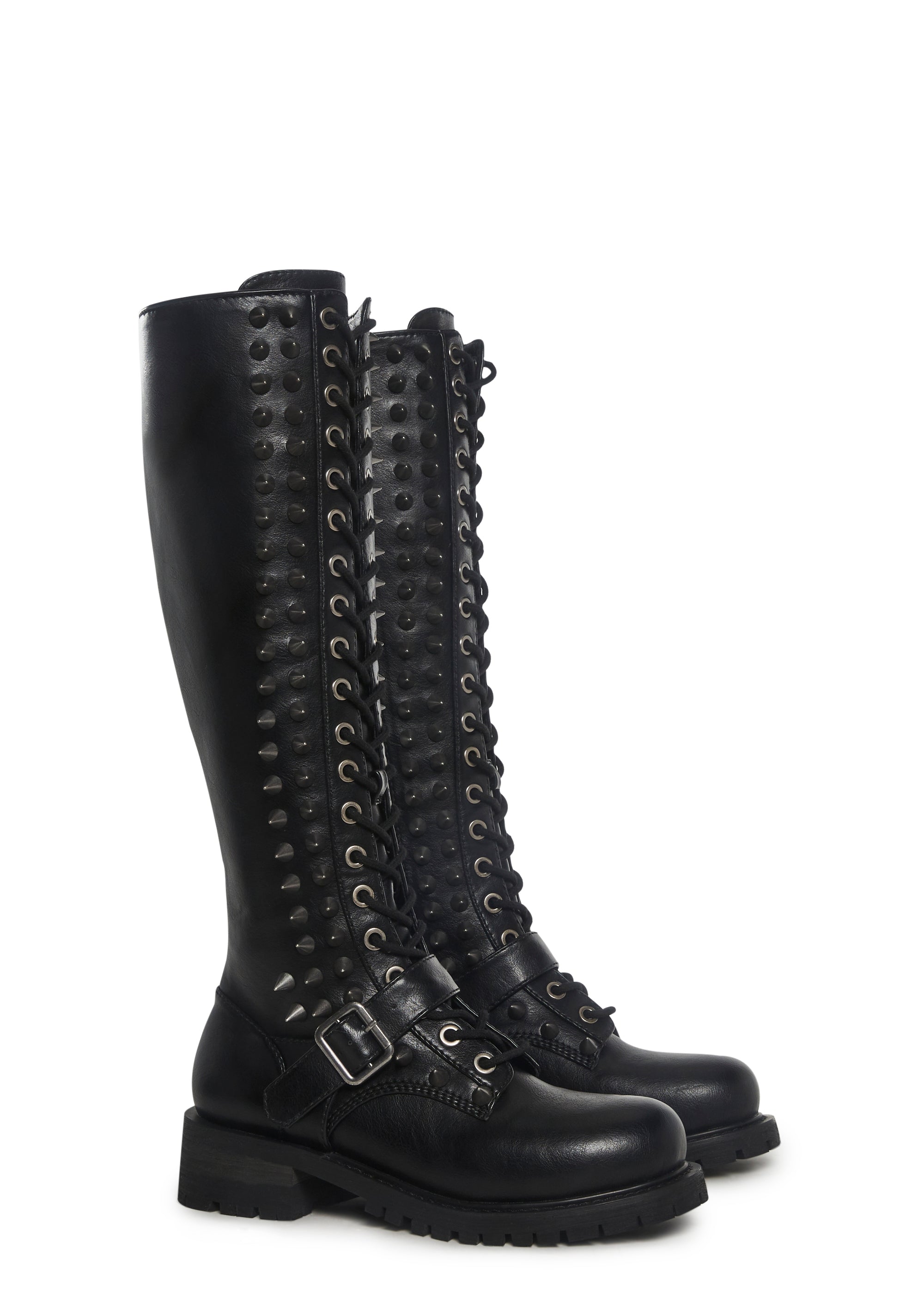 In a smooth vegan leather construction with spiked details. With adjustable buckle, front lace-ups, treaded soles, and side zipper closures.