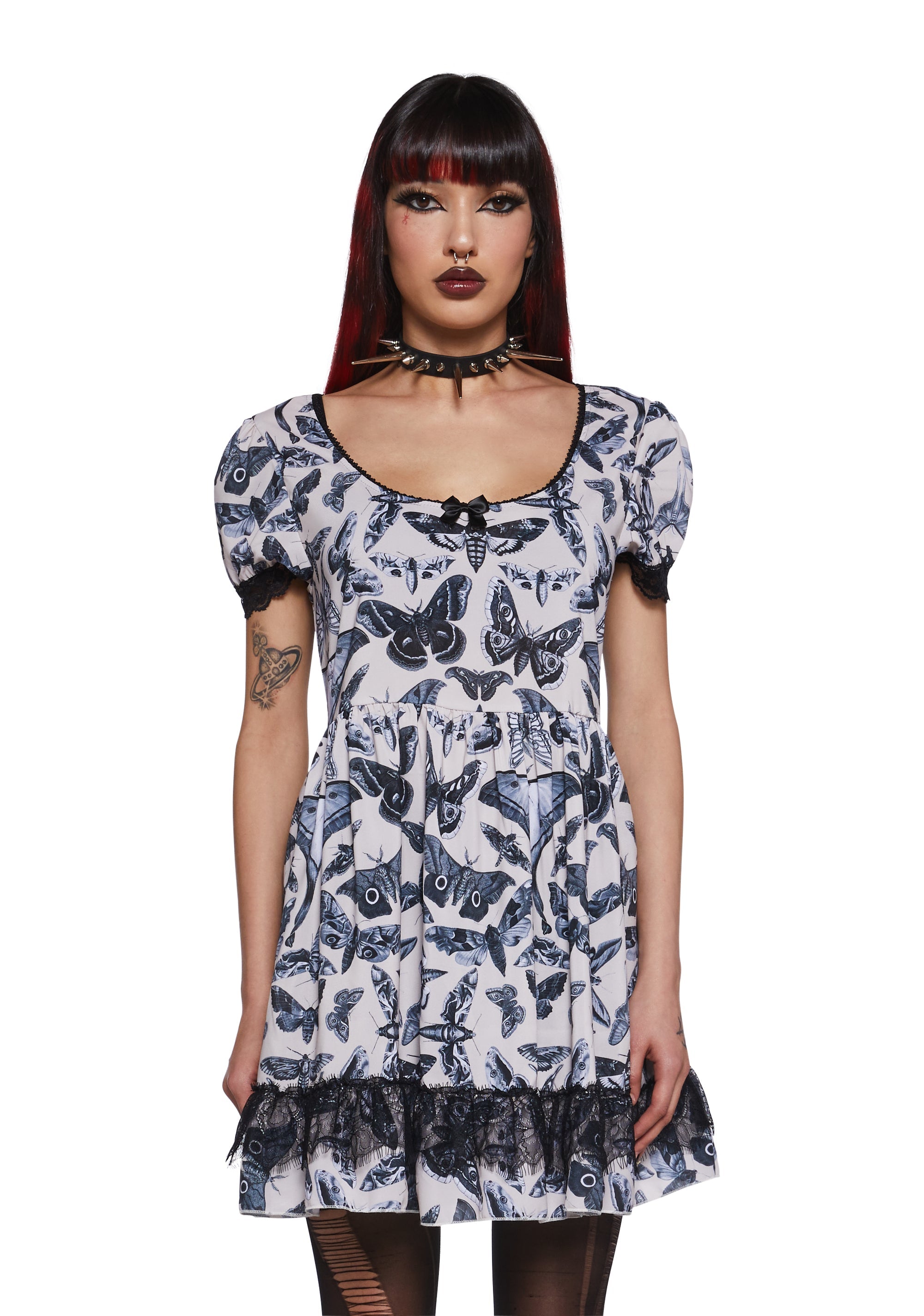 because life is what happens before dawn. This mini dress features short puff sleeves, a cinched waist, a moth print and lace trim all over.