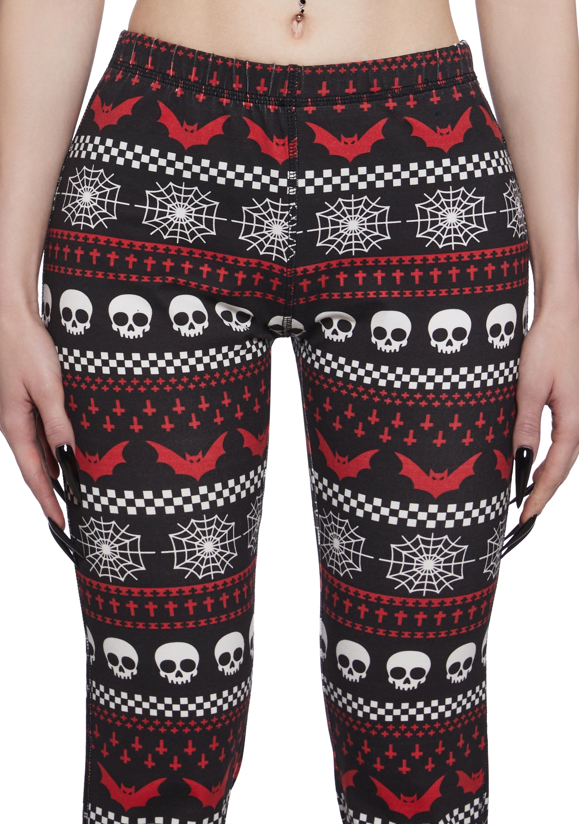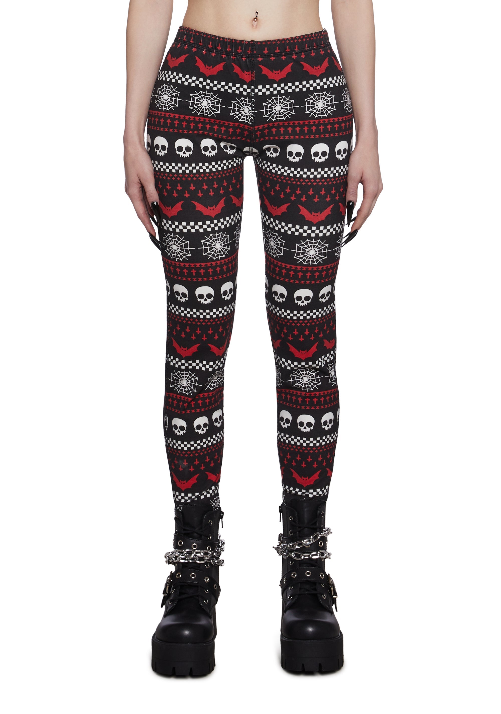 These leggings have a stretchy cotton spandex construction, exposed seam detailing, an elastic waistband, and an all over Fair Isle print of skulls, webs, bats, and crosses.