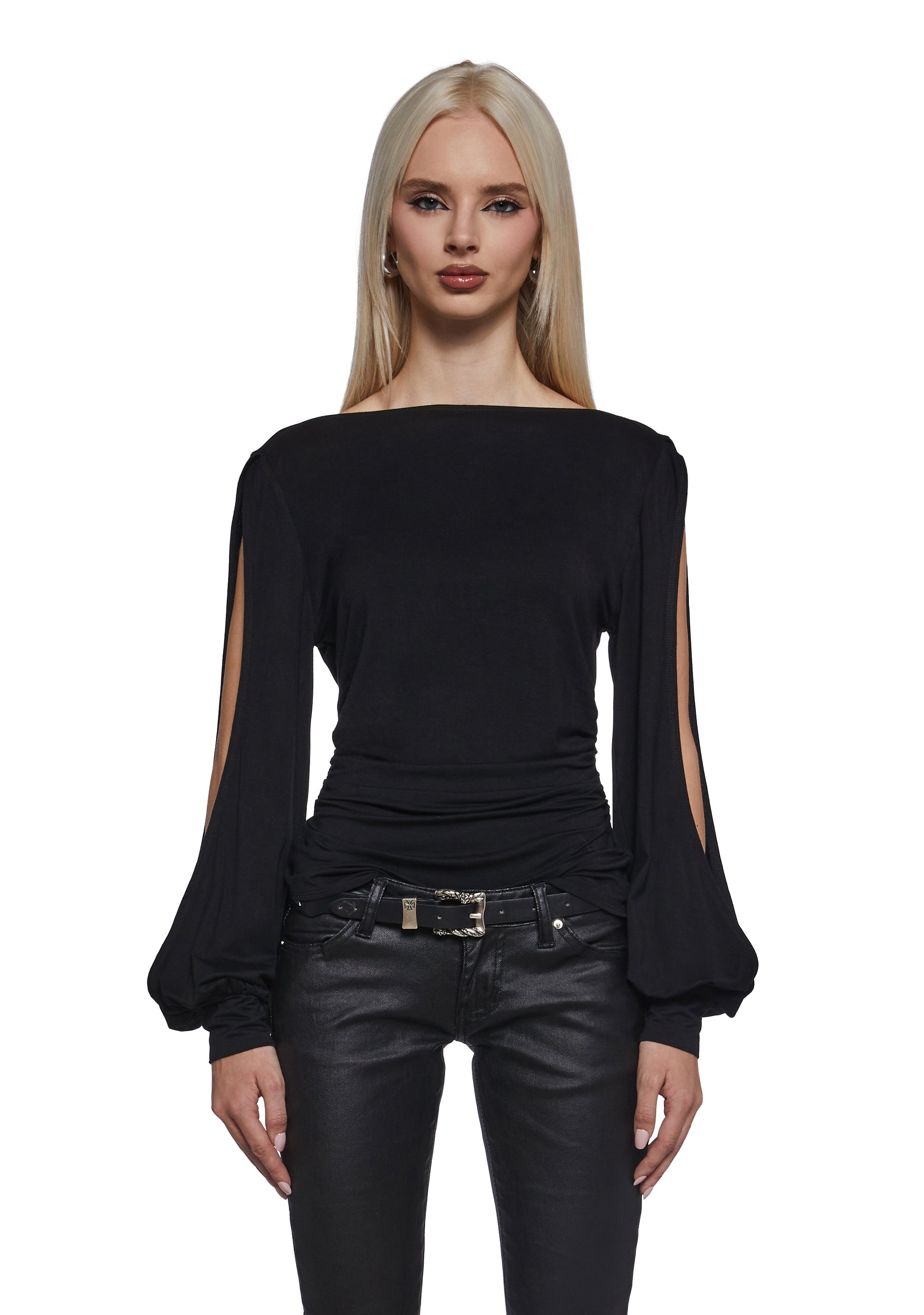 Refined and effortlessly striking, this long-sleeve top features a smooth, body-hugging fit with a dramatic V-shaped open back for an unexpected statement. Designed with a wide boat neckline and flowing slit sleeves, it balances modern elegance with subtle edge—perfect for elevating your evening wardrobe.
