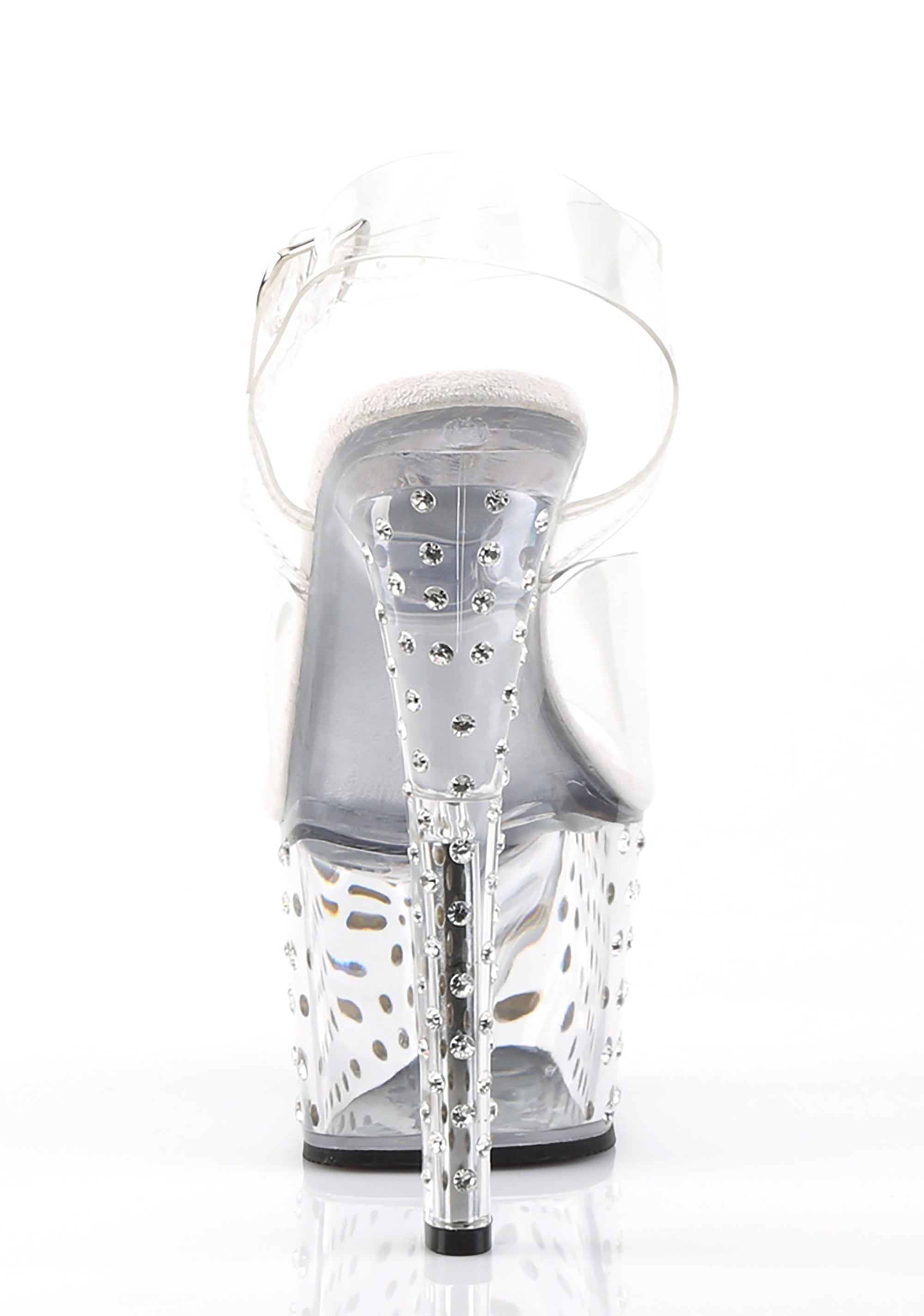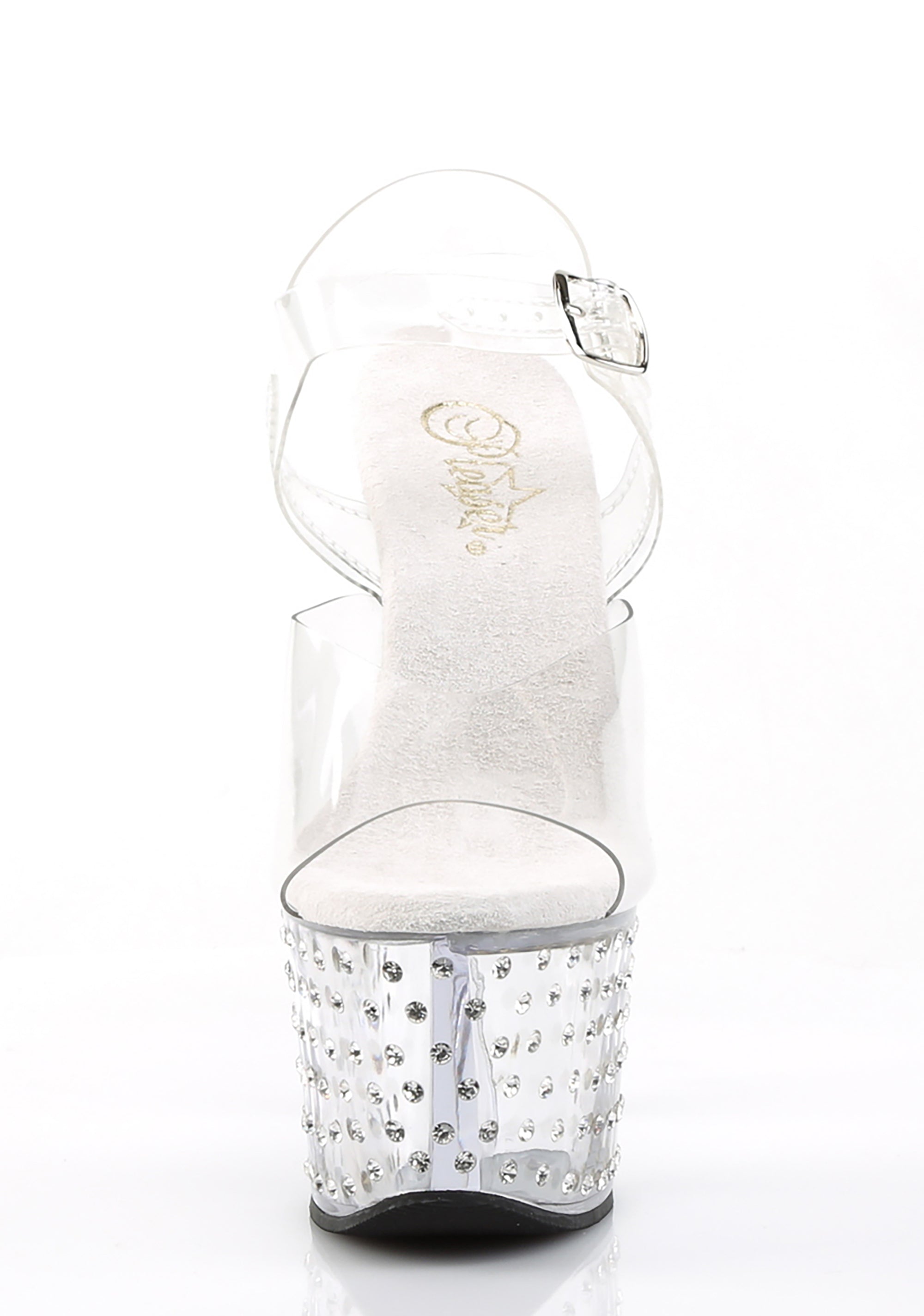 These platform sandals have clear vinyl uppers with a peep toe design, platform soles and heels adorned with sparkling rhinestones, and adjustable ankle buckle strap closures.