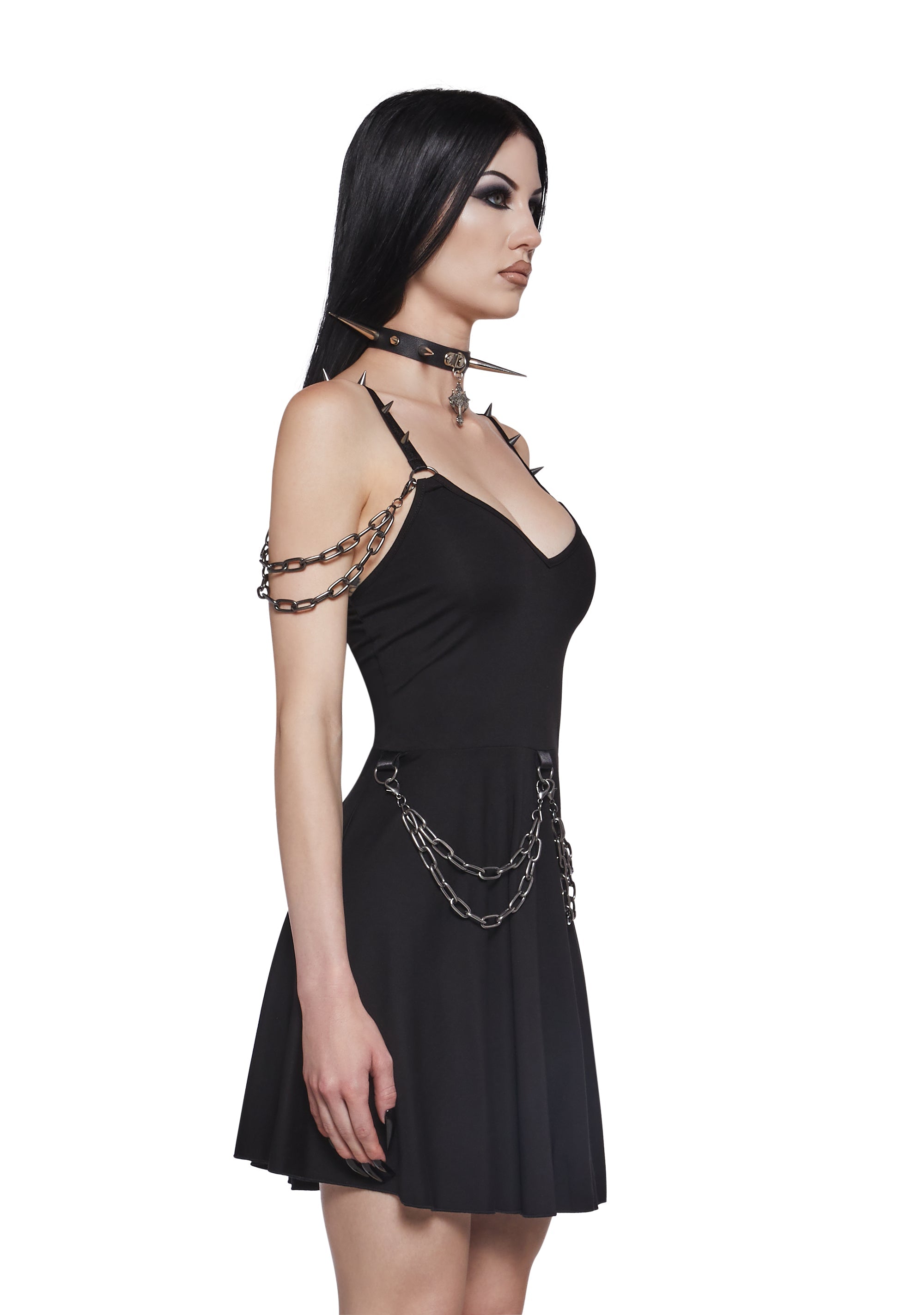 This mini dress has a stretchy rayon construction, adjustable shoulder straps with spiked details, D-ring hardware, and decorative removable chains on the bodice and shoulders.