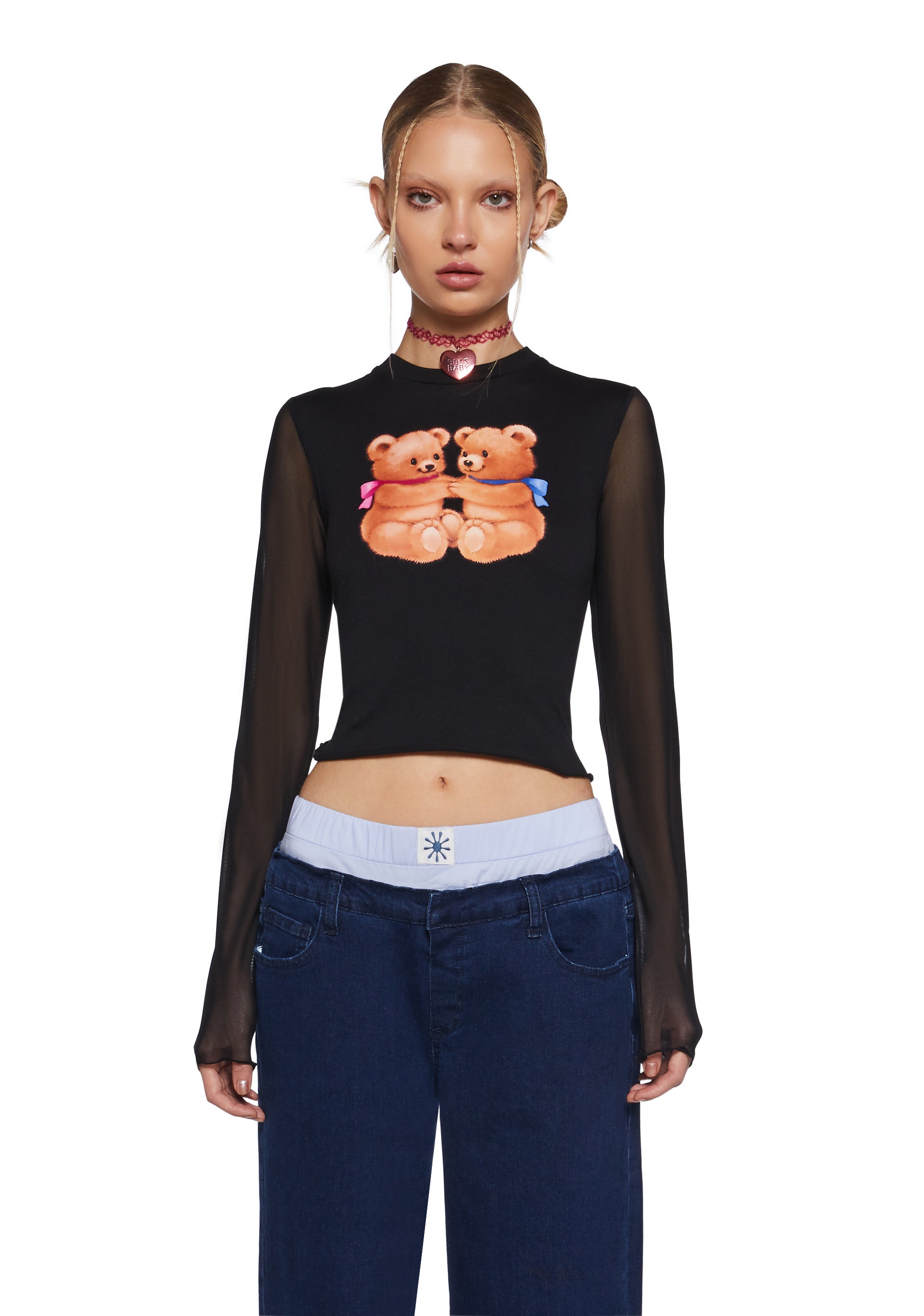 cuz true friendship neva ends, bb! Stay besties 4 lyfe in this supa cute long sleeve top that has a sheer mesh construction, totally adorbs teddy bear graphics on the front N' lettuce-edge trim.
