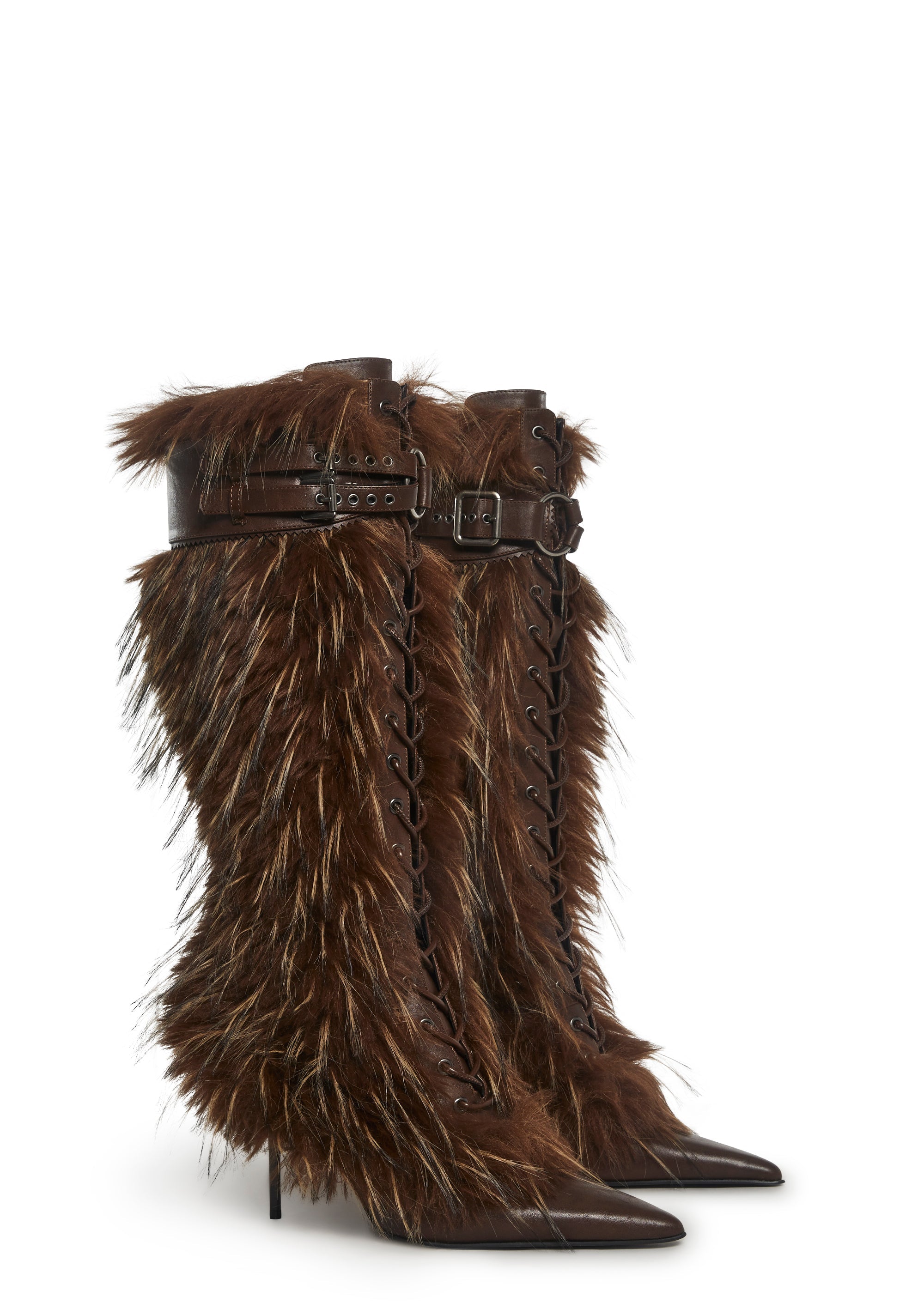 These boots have a multicolored faux fur construction, a pointed toe design, stiletto heels, and adjustable vegan leather strap closures.