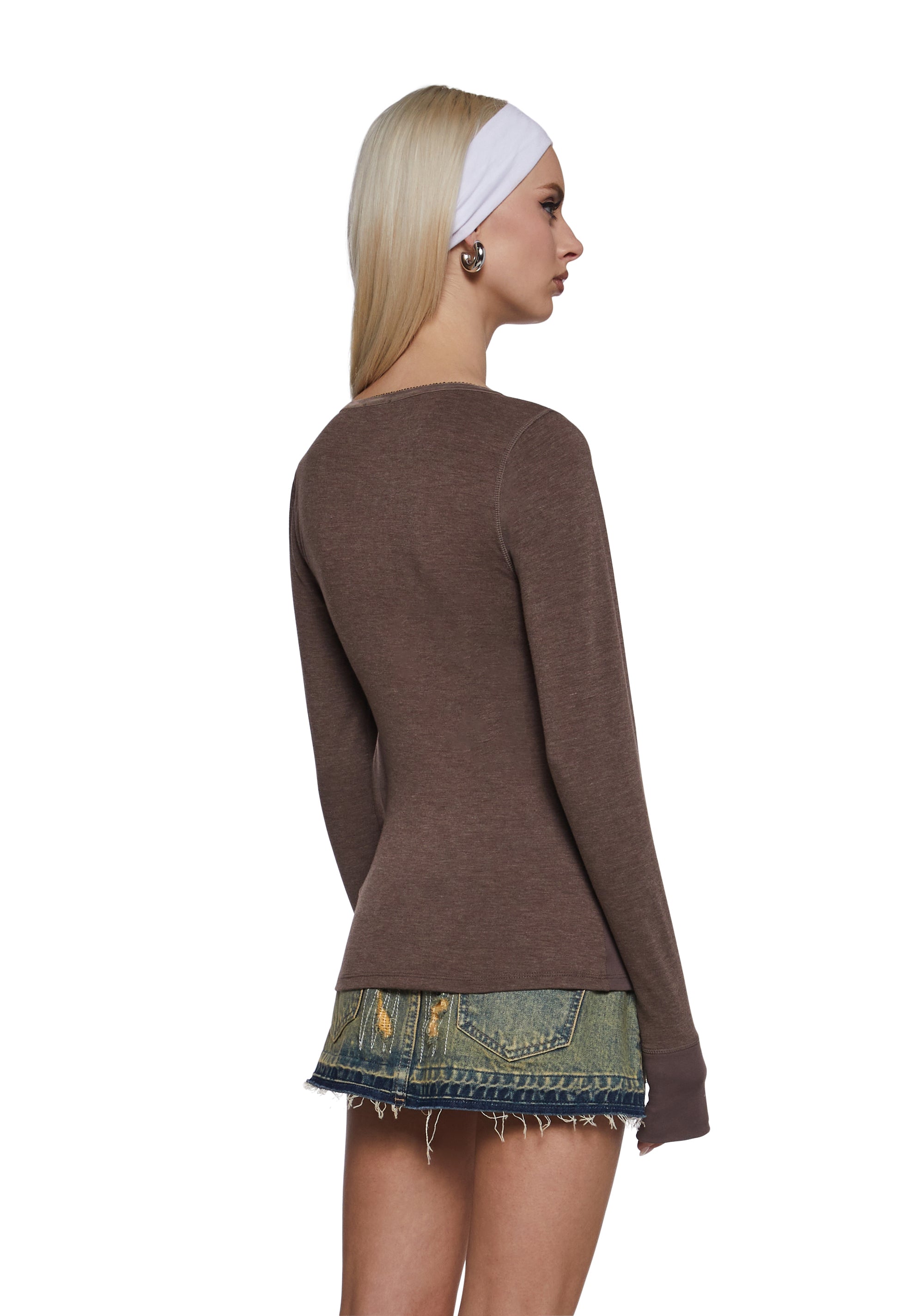 This henley inspired top has a scoop neckline, a picot trim, long sleeves, a ribbed construction, and front button closures.