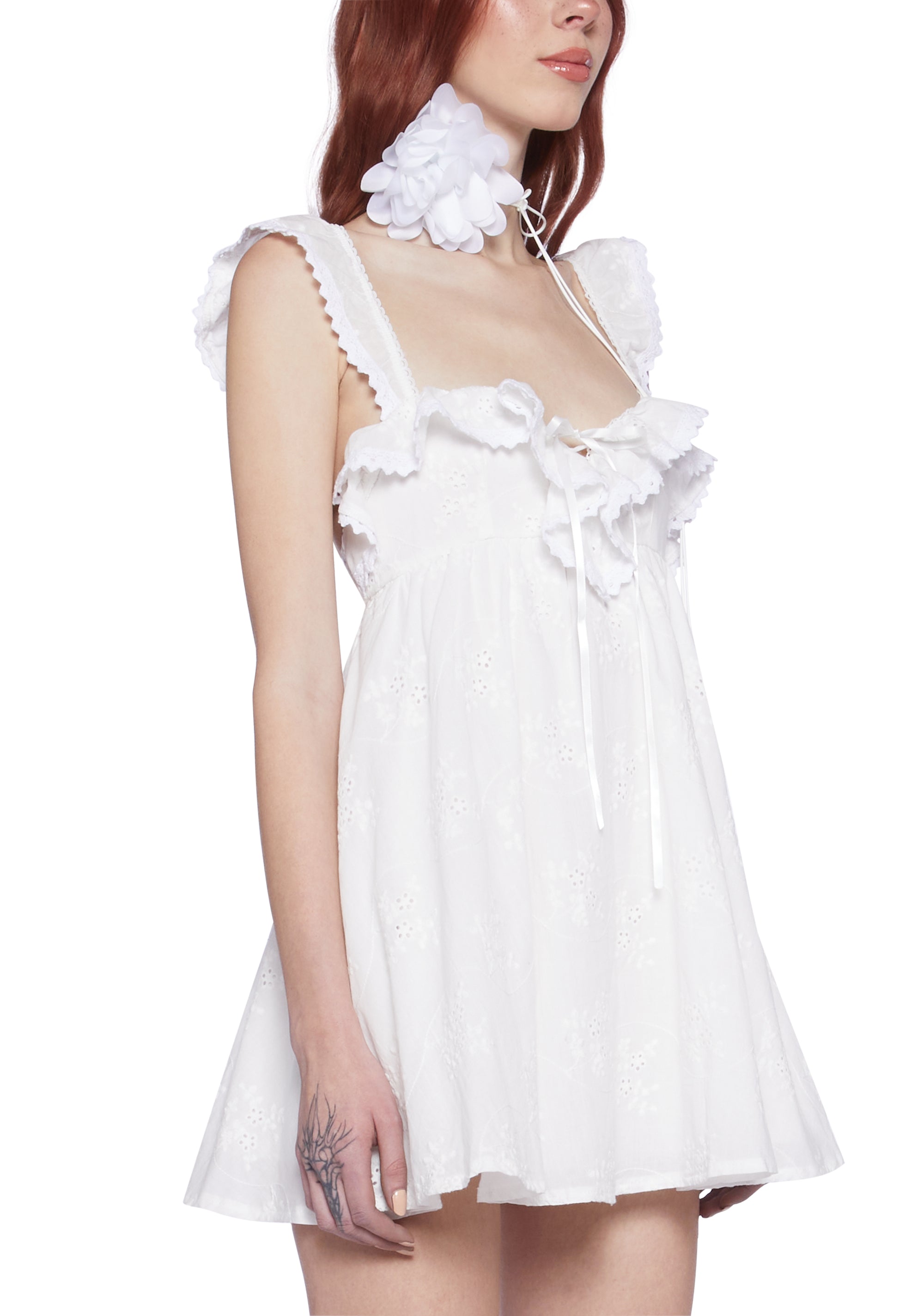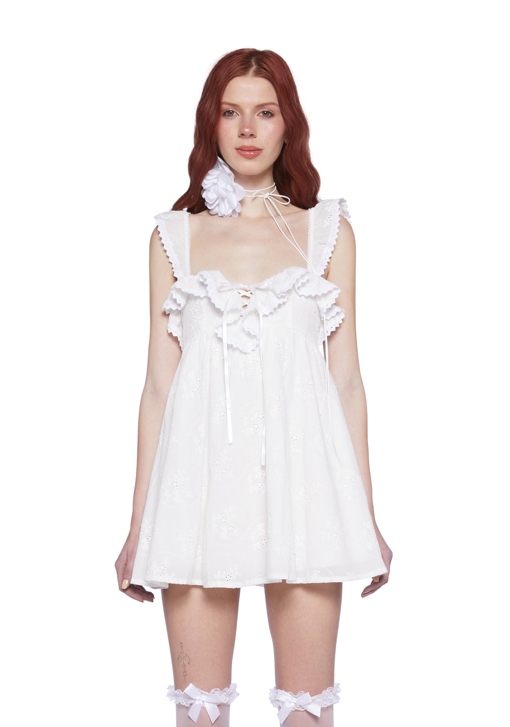 to bathe in the golden glow of the setting sun. This babydoll cotton eyelet lace dress features ruffle details, a picot trim, a self-tie lace-up front closure, and a stretchy ruched back with a zipper closure.