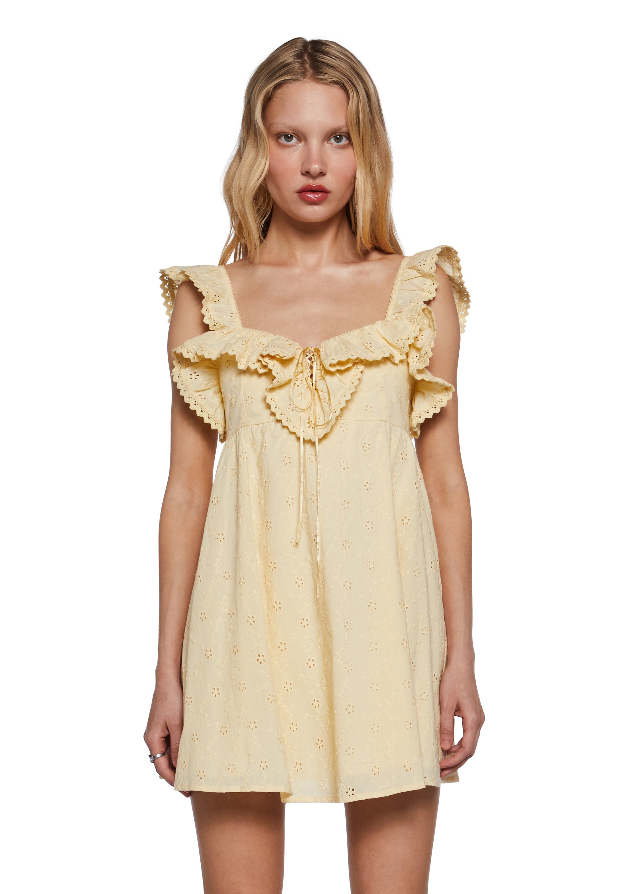 to bathe in the golden glow of the setting sun. This babydoll cotton eyelet lace dress features ruffle details, a picot trim, a self-tie lace-up front closure, and a stretchy ruched back with a zipper closure.