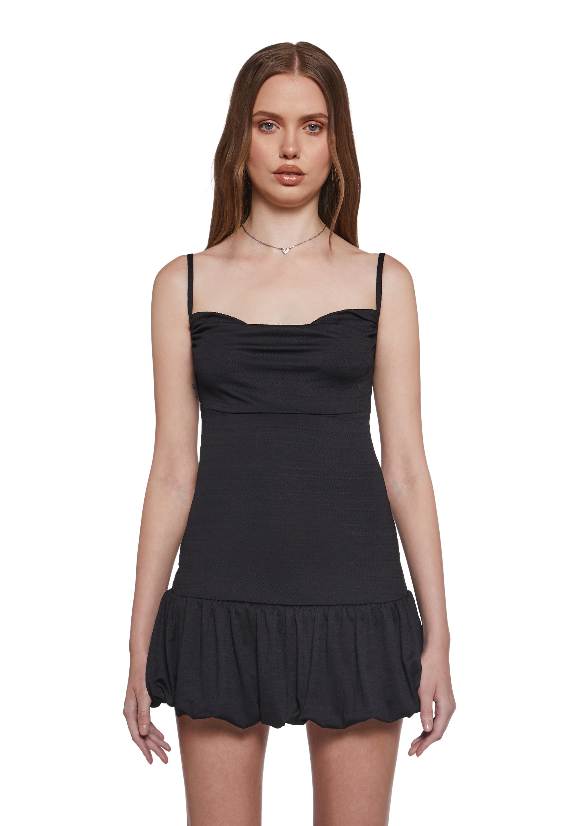 This mini dress has a cowl neckline with adjustable ties in the back, a ruched bust, and a bubble hem.