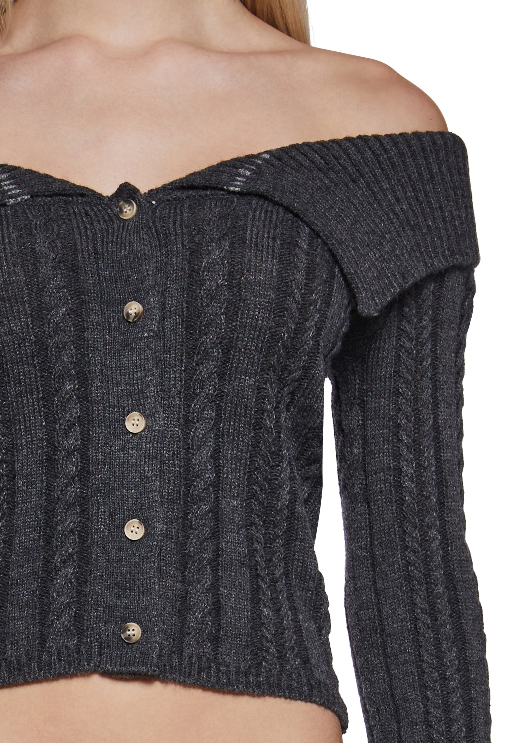 This cardigan has an off the shoulder design, chunky knit construction, long sleeves, a cropped fit, and front button closures.