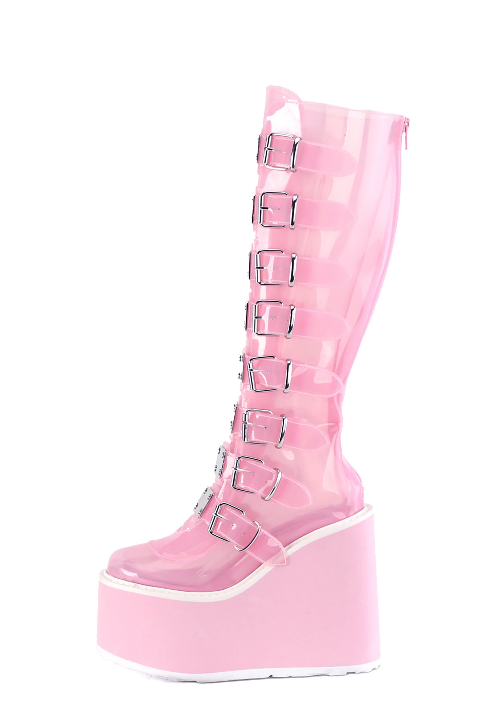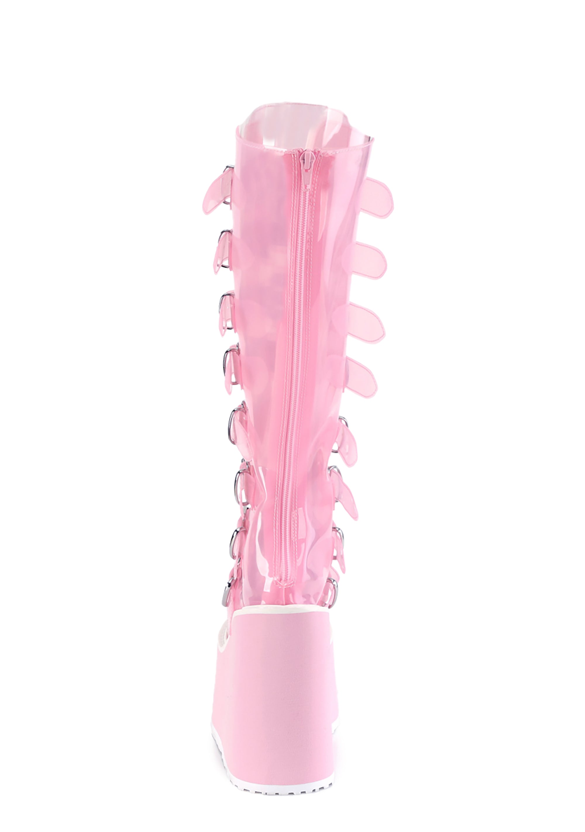 cuz you'll fuel their robot hearts, babe. These knee high platform boots have a clear pink vinyl construction, tons of adjustable buckle straps down the front with metal plates, and back zip closures.