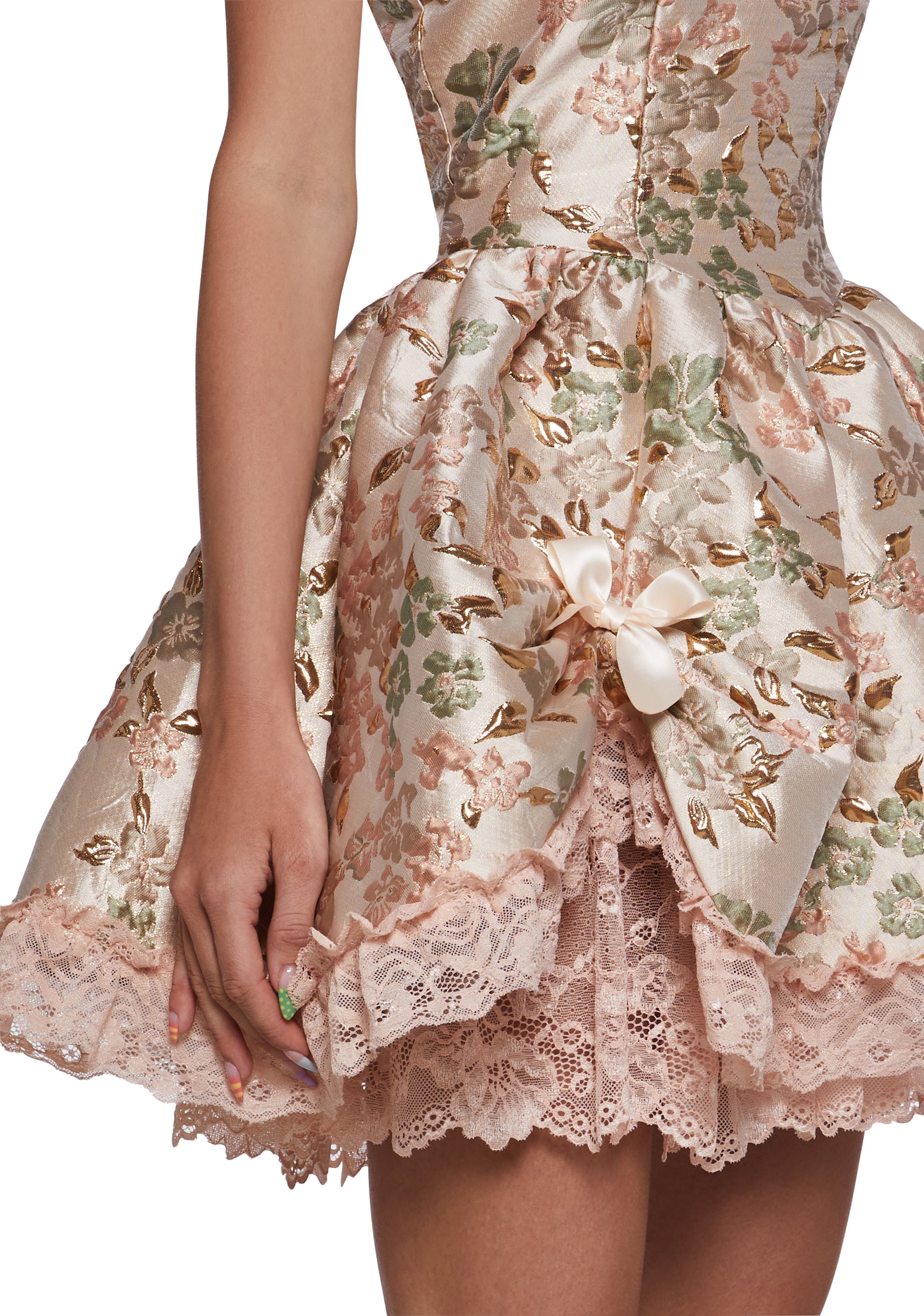 cuz you are cordially invited. This brocade mini dress has puffy sleeves, a sweetheart neckline, a fabric lace trim, bow detailing, and a back zipper closure.
