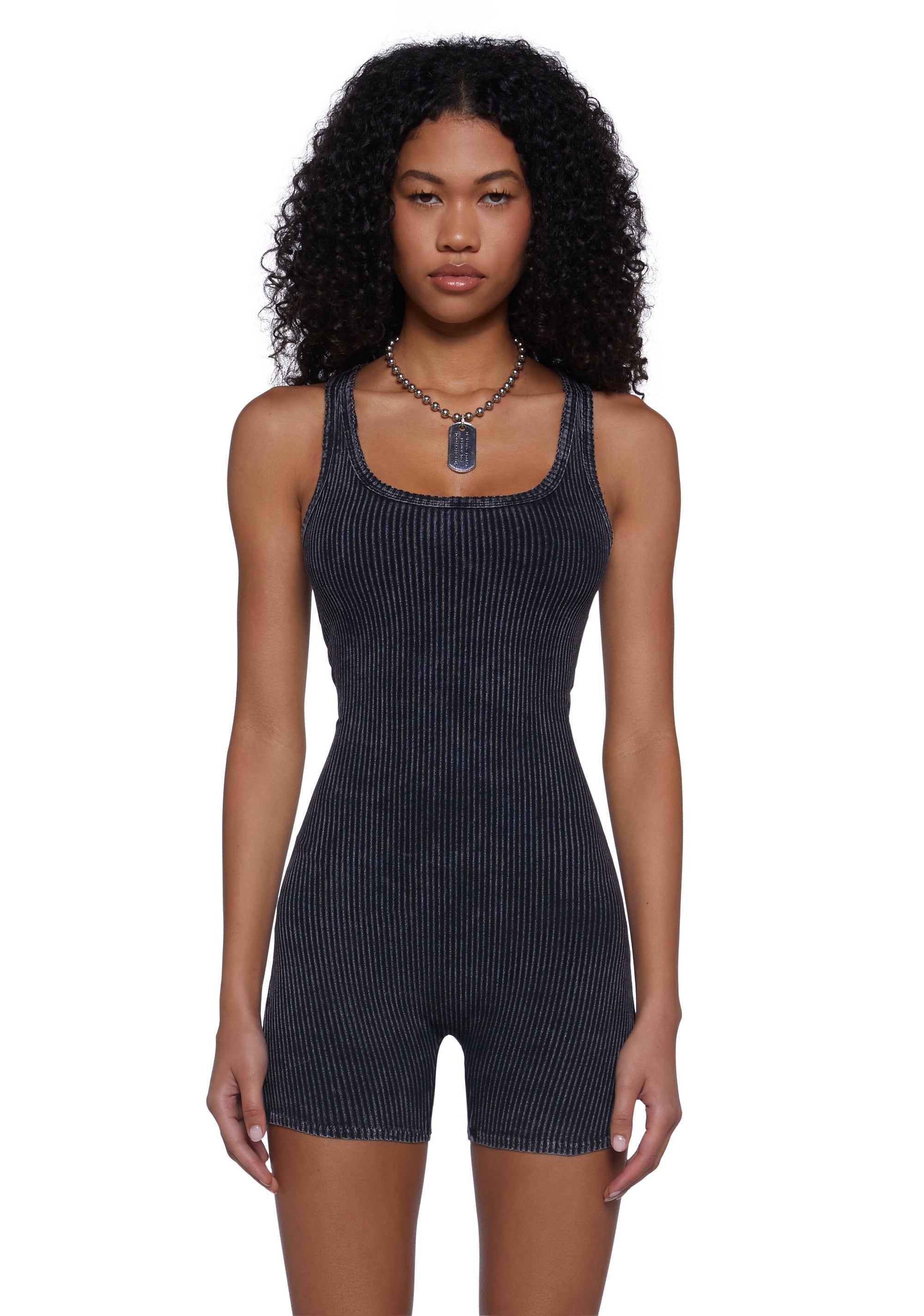 This romper has a knit ribbed construction, a washed finish, and a racerback design with cut out details.