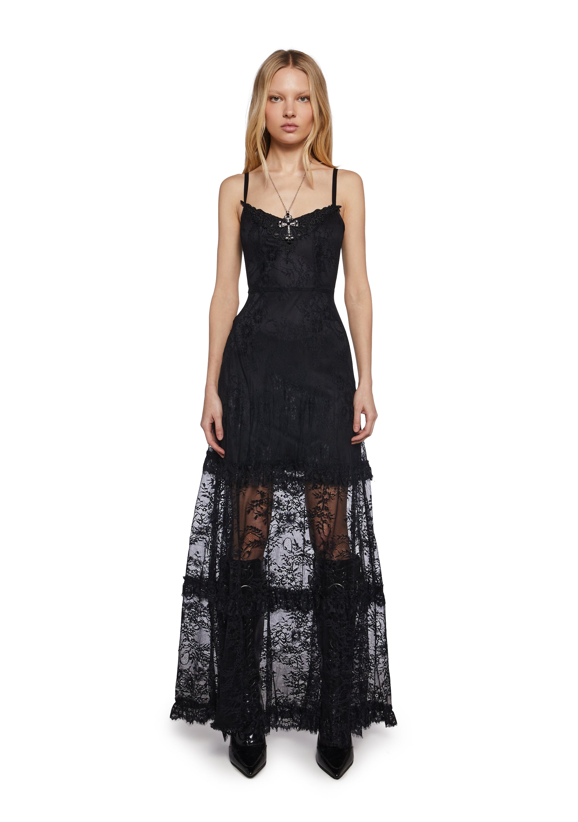 cuz you have to let go of your vulnerabilities. Show ur raw side with this lace maxi dress that has a ruffled trim on the skirt, a v neckline and a strappy tie detail on the back.